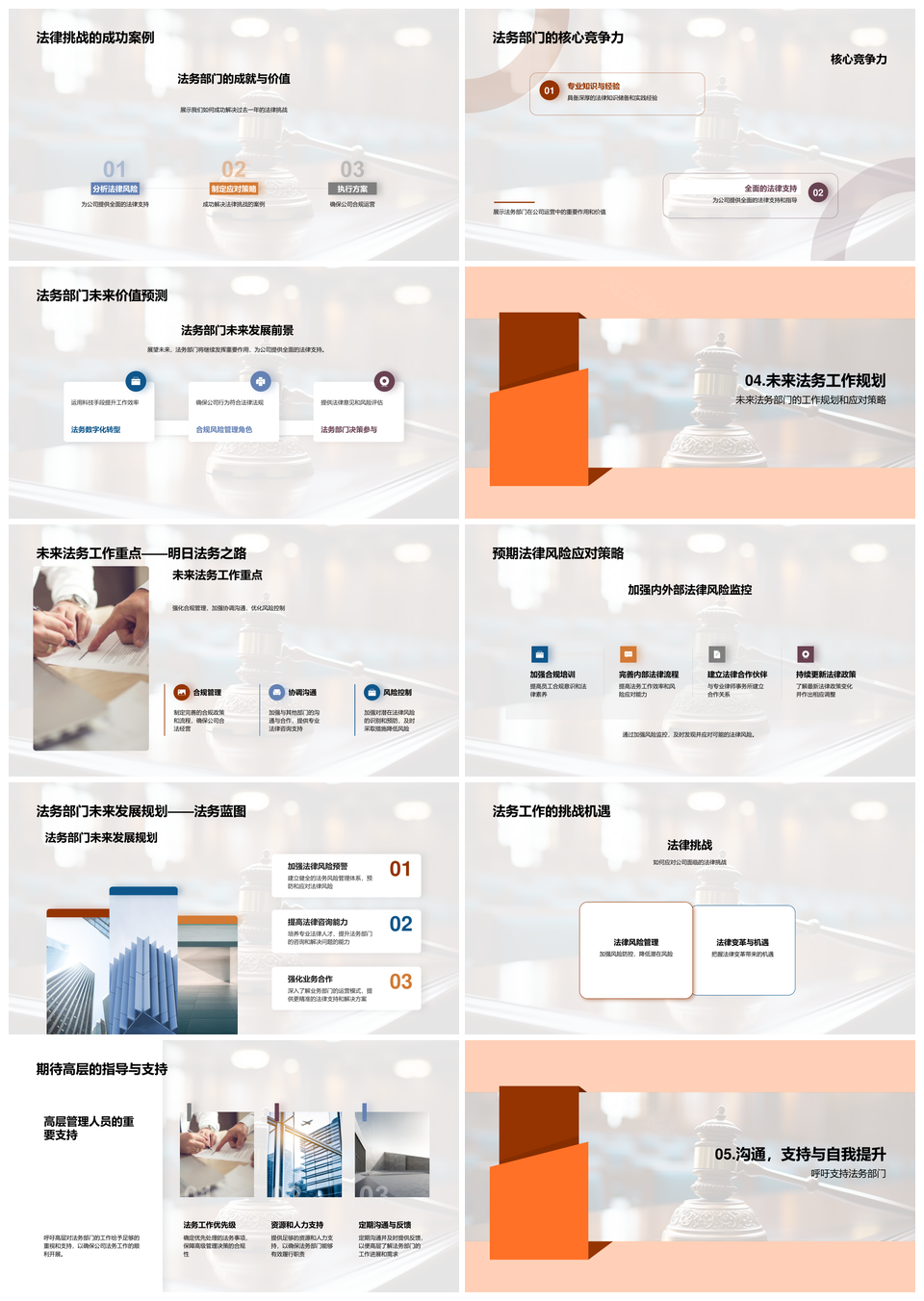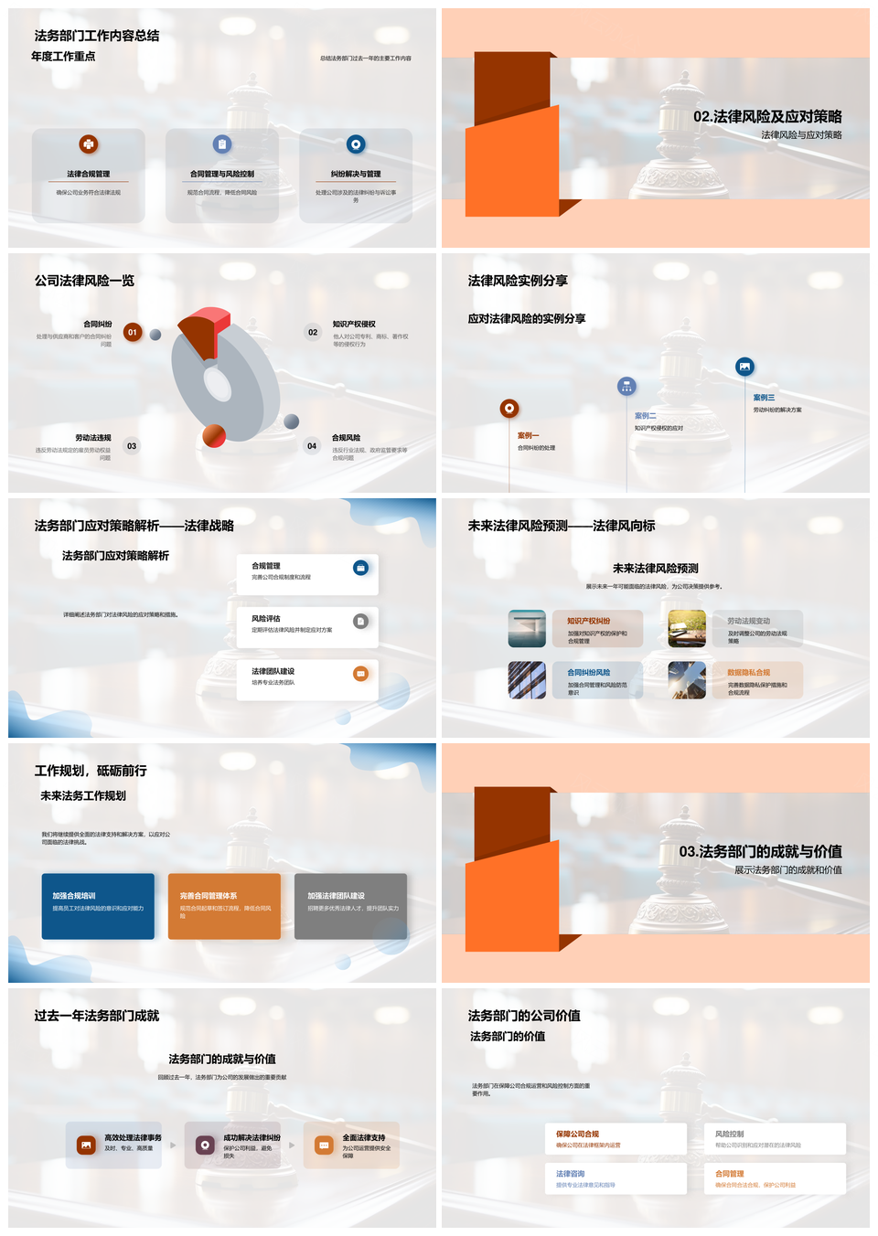 这是一张法务年度总结业务法律挑战风险应对法槌护航PPT模板,包含法务、年度总结、业务、法律挑战、风险应对、法槌、护航等主题内容,也可用作法务年度总结业务法律挑战、年度总结业务法律挑战风险、总结业务法律挑战风险应对、法律挑战风险应对法槌护航、法务年度总结业务法律、年度总结业务法律挑战、业务法律挑战风险应对、法律挑战风险应对法槌、挑战风险应对法槌护航、法务年度总结业务、年度总结业务法律、业务法律挑战风险、法律挑战风险应对、挑战风险应对法槌、风险应对法槌护航等PPT场景使用。 风云办公提供的法务年度总结业务法律挑战风险应对法槌护航PPT模板,下载格式为pptx,一共33页,作品中文字及图均可以修改和编辑,图片更改请在作品中右键图片并更换,文字修改请直接点击文字进行修改。
