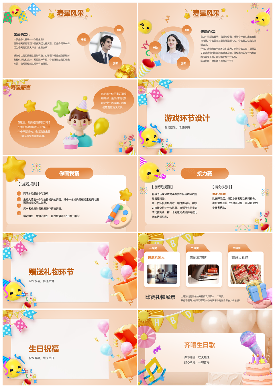 这是一张职场员工生日会互动游戏礼品摄影团队祝福凝聚力PPT模板,包含职场、员工、生日会、互动游戏、礼品、摄影团队、祝福、凝聚力等主题内容,也可用作职场员工生日会互动游戏、员工生日会互动游戏礼品、生日会互动游戏礼品摄影、互动游戏礼品摄影团队、礼品摄影团队祝福凝聚力、职场员工生日会互动、员工生日会互动游戏、生日会互动游戏礼品、互动游戏礼品摄影、礼品摄影团队祝福、摄影团队祝福凝聚力、职场员工生日会、员工生日会互动、生日会互动游戏、互动游戏礼品、礼品摄影团队、摄影团队祝福、团队祝福凝聚力、生日会礼品、员工祝福、团队凝聚力等PPT场景使用。 风云办公提供的职场员工生日会互动游戏礼品摄影团队祝福凝聚力PPT模板,下载格式为pptx,一共20页,作品中文字及图均可以修改和编辑,图片更改请在作品中右键图片并更换,文字修改请直接点击文字进行修改。