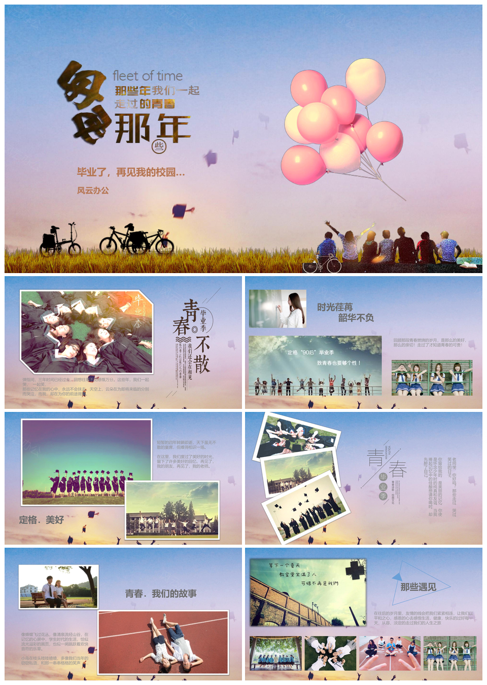 风云办公提供的毕业季电子相册青春纪念册PPT模板,下载格式为pptx,一共23页,作品中文字及图均可以修改和编辑,图片更改请在作品中右键图片并更换,文字修改请直接点击文字进行修改。