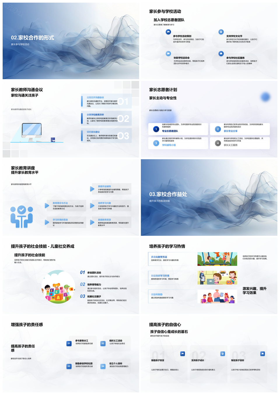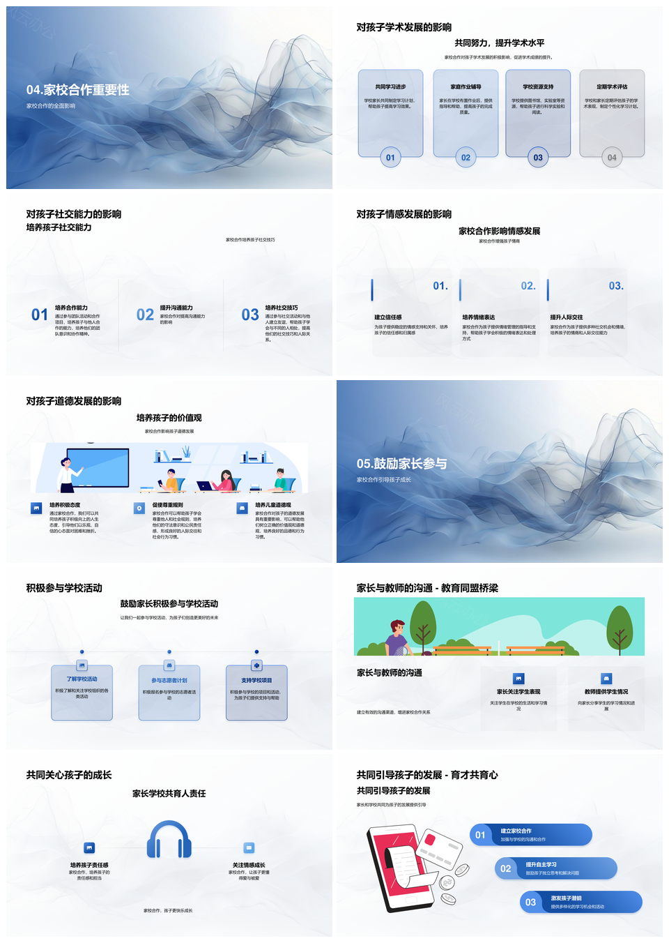 本模板以深邃蓝色为主调,融入抽象流动线条与几何光影设计,呼应波粒二象性的科学隐喻,诠释家校共育中个体与整体的动态平衡。模块化排版清晰划分“沟通机制”“资源整合”“成长评估”等战略板块,激光切割般的视觉分区突显现代专业性。渐变粒子背景象征教育中持续的能量传递,半透明叠加图表让数据呈现更具层次。模板内置20+教育场景图示,支持一键替换教育理论模型图,适用于家校联席会议、教育成果汇报等专业场景,兼顾学术严谨性与视觉传达效率。