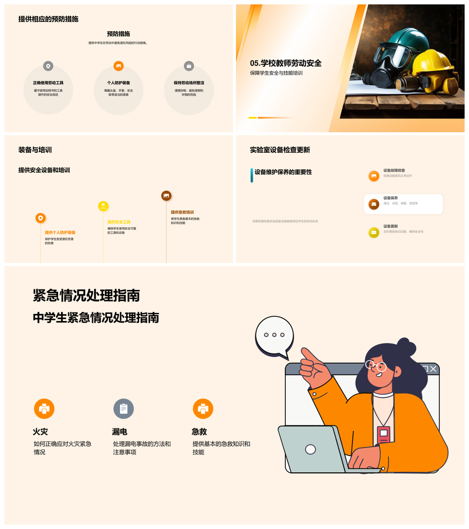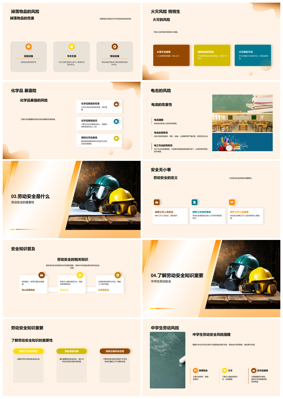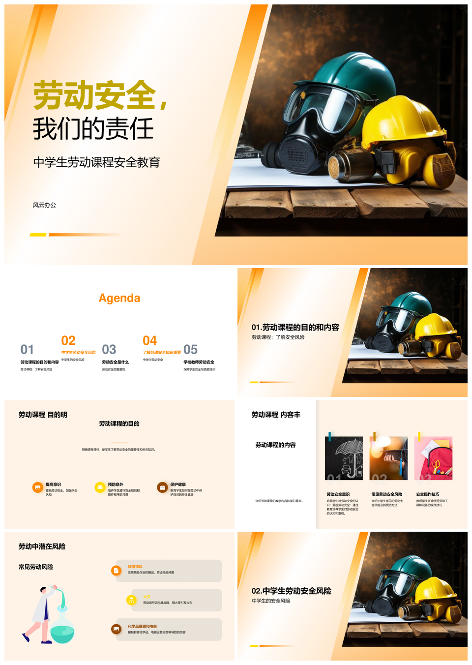 风云办公提供的中学生劳动安全风险防范与防护装备PPT模板,下载格式为pptx,一共23页,作品中文字及图均可以修改和编辑,图片更改请在作品中右键图片并更换,文字修改请直接点击文字进行修改。