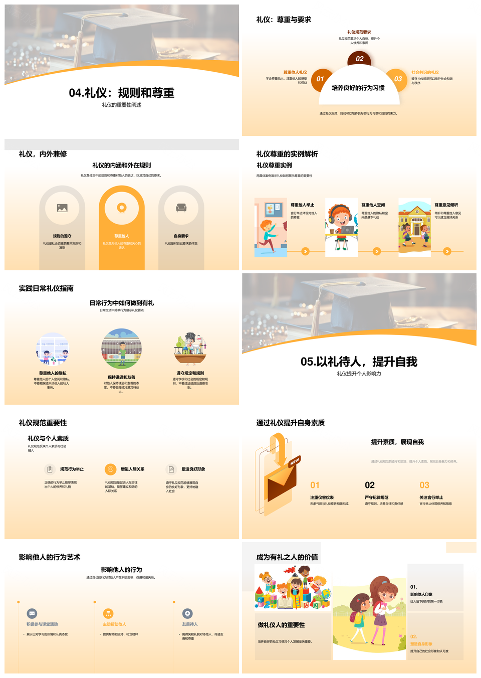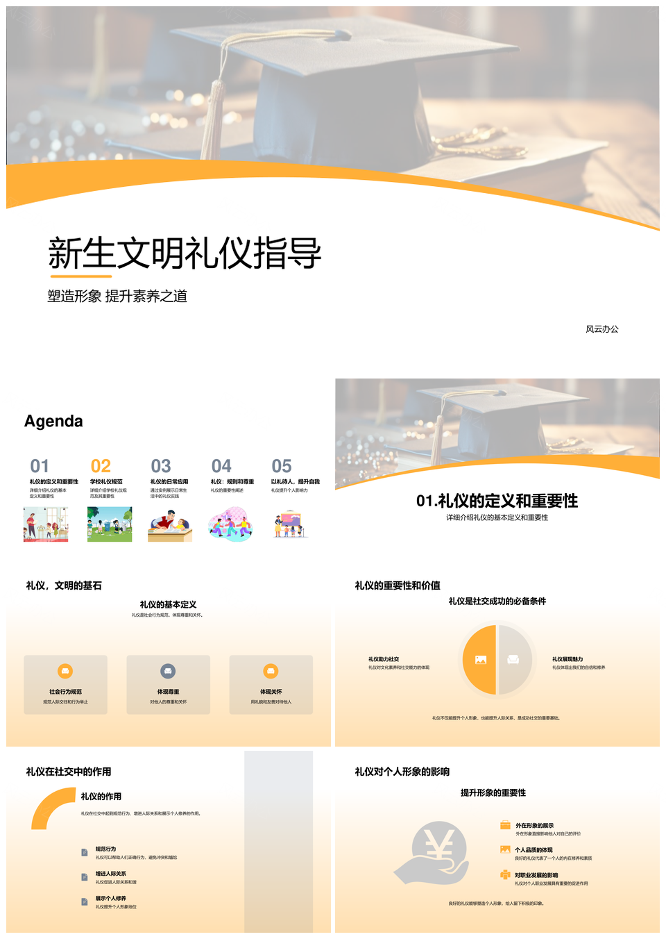 风云办公提供的新生文明礼仪校园行为规范指导PPT模板,下载格式为pptx,一共28页,作品中文字及图均可以修改和编辑,图片更改请在作品中右键图片并更换,文字修改请直接点击文字进行修改。