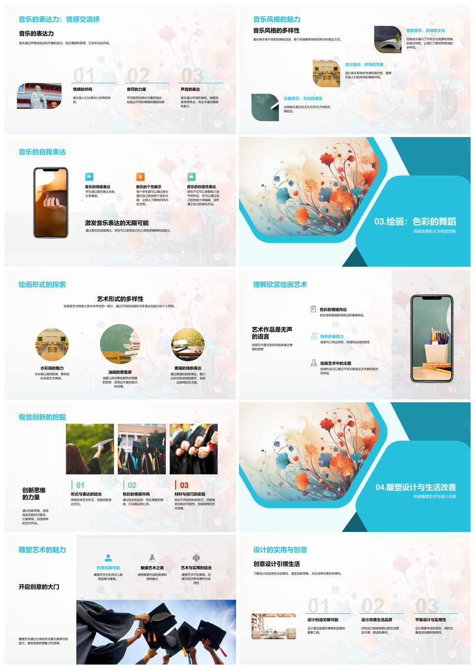 这是一张艺术学音乐绘画雕塑设计分类与创新表达PPT模板,包含艺术学、音乐、绘画、雕塑、设计、分类、创新表达等主题内容,也可用作艺术学音乐绘画雕塑设计、艺术学音乐绘画分类、艺术学音乐创新表达、音乐绘画雕塑设计分类、绘画雕塑设计创新表达、雕塑设计分类与创新、设计分类与创新表达、艺术学音乐绘画、音乐绘画雕塑设计、绘画雕塑创新表达、艺术学设计分类、雕塑设计创新、设计分类创新、音乐绘画创新、分类创新表达等PPT场景使用。 风云办公提供的艺术学音乐绘画雕塑设计分类与创新表达PPT模板,下载格式为pptx,一共27页,作品中文字及图均可以修改和编辑,图片更改请在作品中右键图片并更换,文字修改请直接点击文字进行修改。