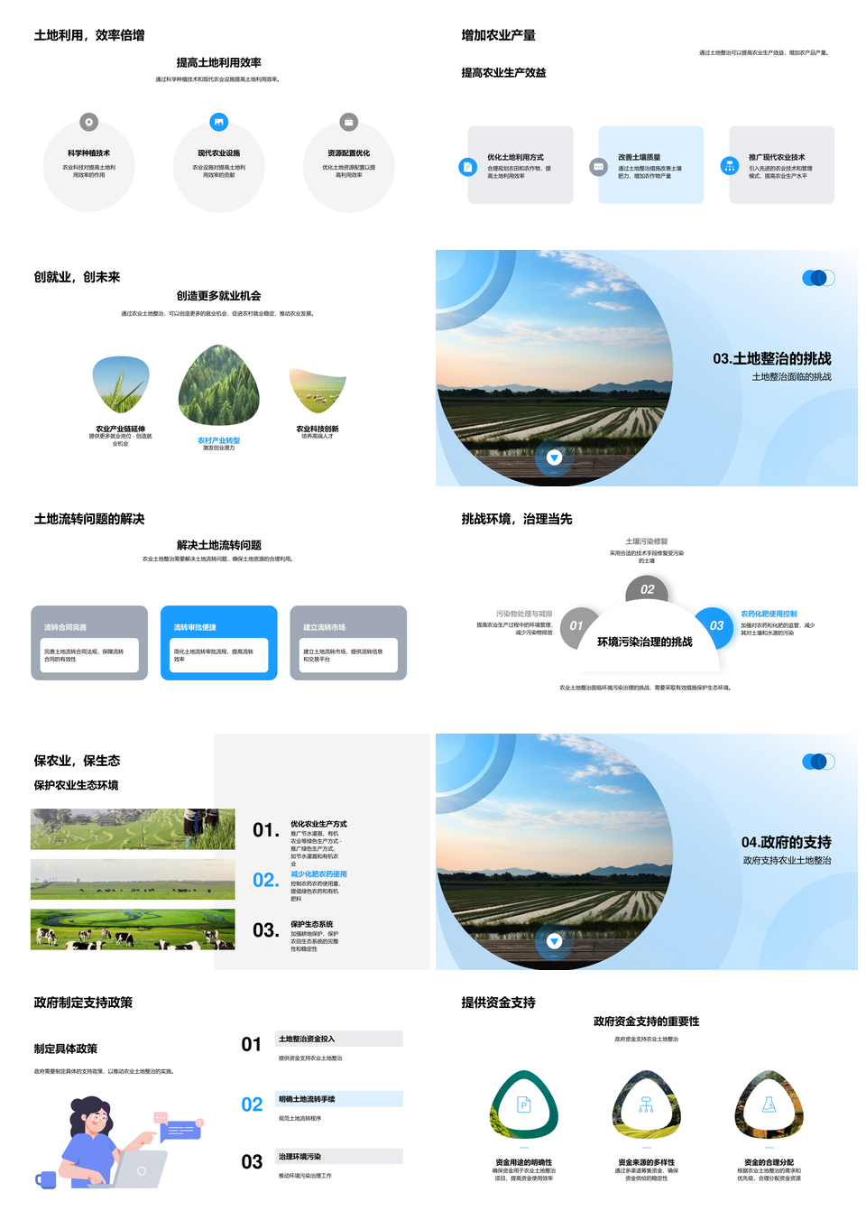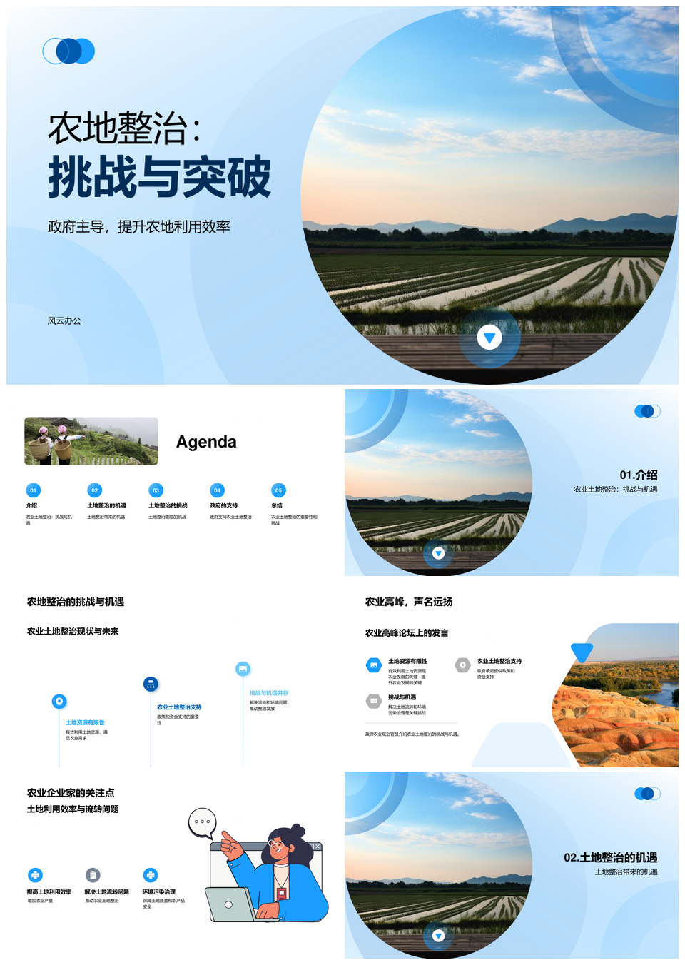 这是一张农业土地整治挑战机遇政企共议农田增效PPT模板,包含农业、土地整治、挑战、机遇、政企、共议、农田、增效等主题内容,也可用作农业土地整治挑战、土地整治挑战机遇、整治挑战机遇政企、挑战机遇政企共议、机遇政企共议农田、政企共议农田增效、农业土地整治挑战机遇、土地整治挑战机遇政企、整治挑战机遇政企共议、挑战机遇政企共议农田、机遇政企共议农田增效、农业土地整治、土地整治挑战、整治挑战机遇、挑战机遇政企等PPT场景使用。 风云办公提供的农业土地整治挑战机遇政企共议农田增效PPT模板,下载格式为pptx,一共23页,作品中文字及图均可以修改和编辑,图片更改请在作品中右键图片并更换,文字修改请直接点击文字进行修改。