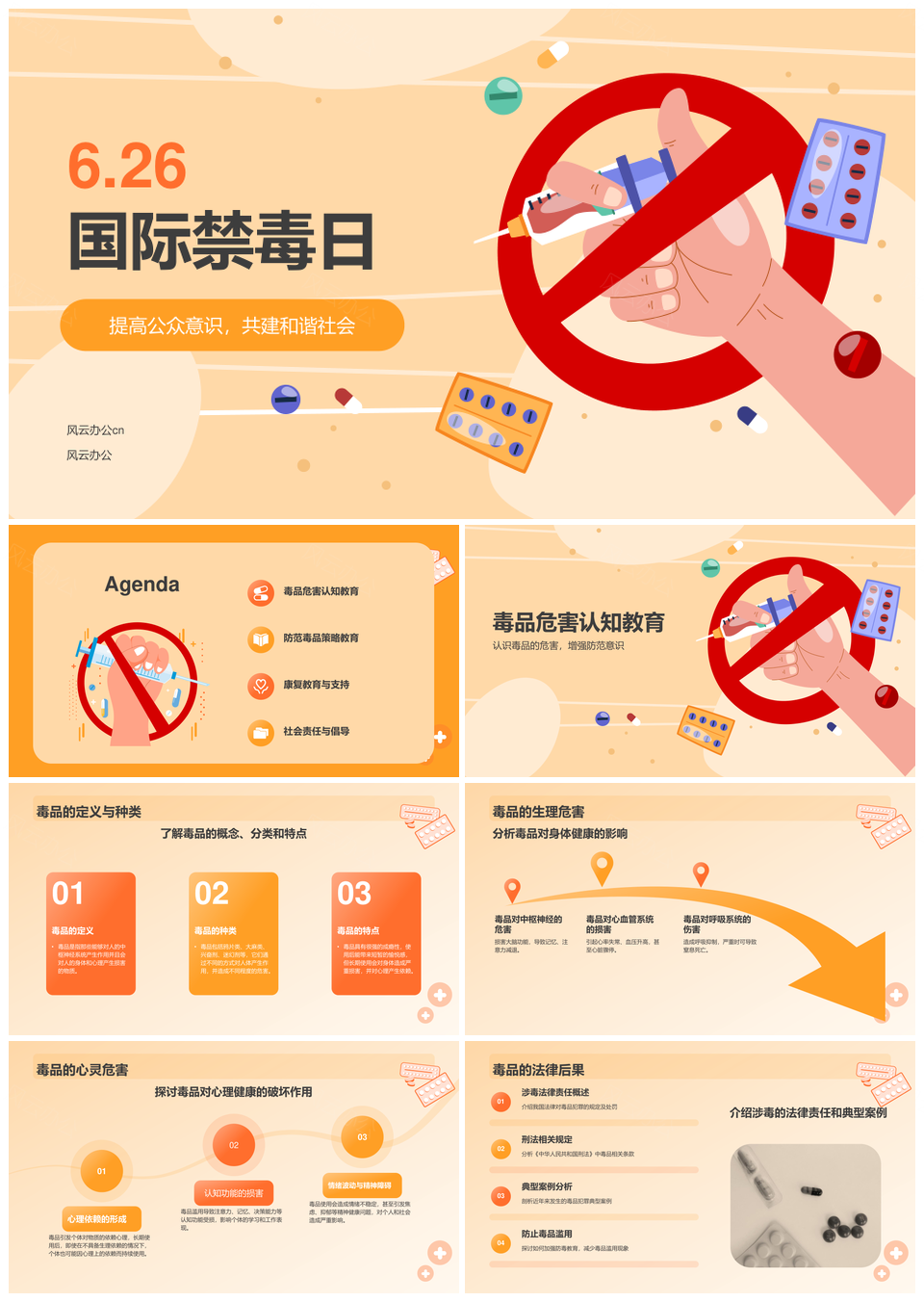 风云办公提供的国际禁毒日防毒安全教育健康宣传周PPT模板,下载格式为pptx,一共21页,作品中文字及图均可以修改和编辑,图片更改请在作品中右键图片并更换,文字修改请直接点击文字进行修改。