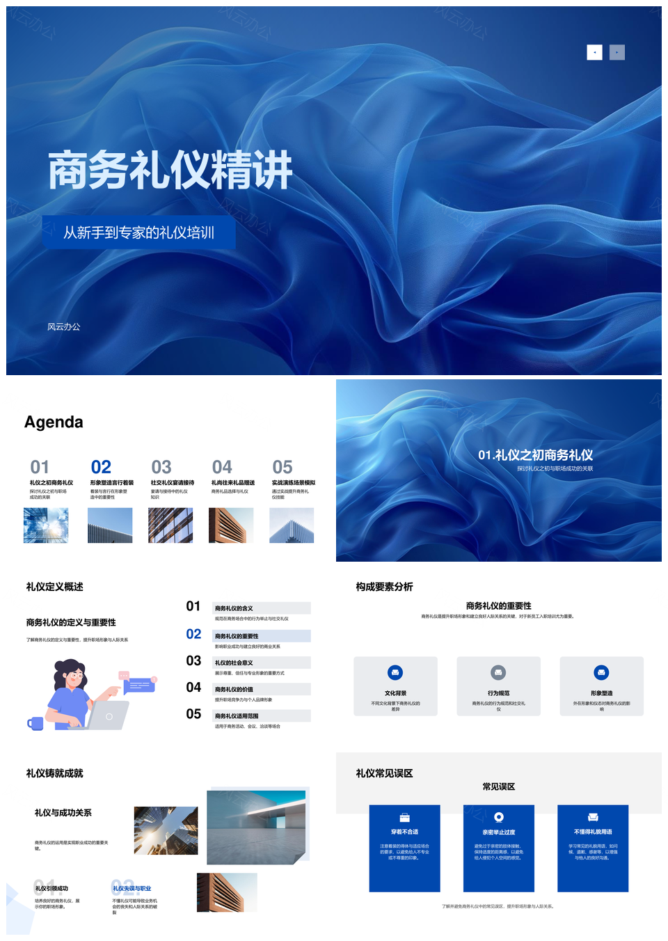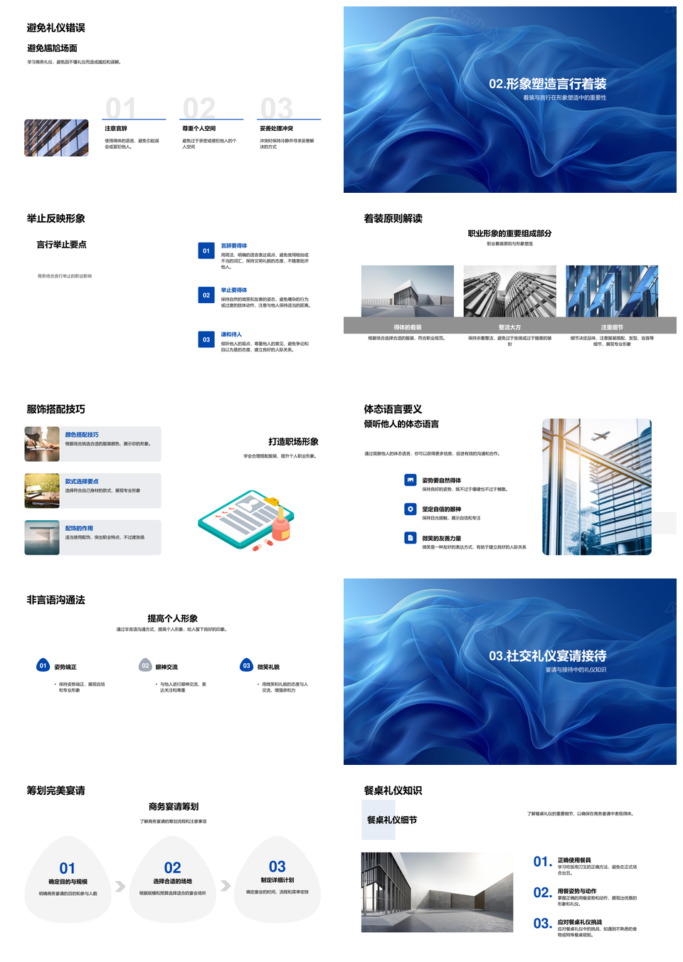 这是一张商务礼仪培训新员工职场服饰言谈误区解析PPT模板,包含商务礼仪、培训、新员工、职场、服饰、言谈、误区、解析等主题内容,也可用作商务礼仪培训新员工职场、培训新员工职场服饰、新员工职场服饰言谈、职场服饰言谈误区、服饰言谈误区解析、商务礼仪培训新员工、培训新员工职场、新员工职场服饰、职场服饰言谈、服饰言谈误区、言谈误区解析、商务礼仪培训、培训新员工、新员工职场、职场服饰等PPT场景使用。 风云办公提供的商务礼仪培训新员工职场服饰言谈误区解析PPT模板,下载格式为pptx,一共33页,作品中文字及图均可以修改和编辑,图片更改请在作品中右键图片并更换,文字修改请直接点击文字进行修改。