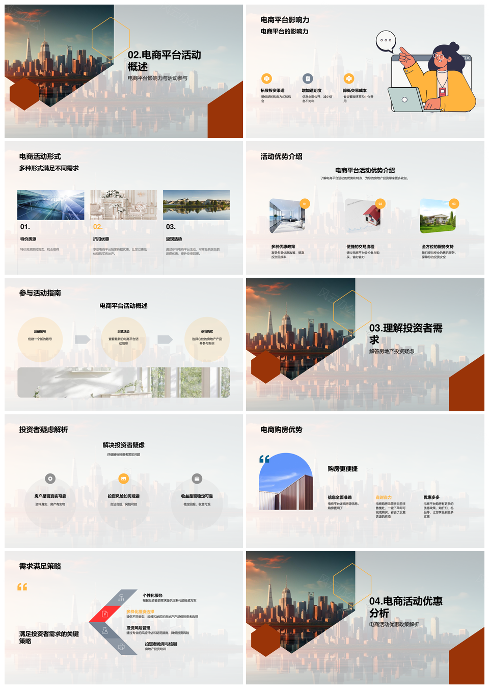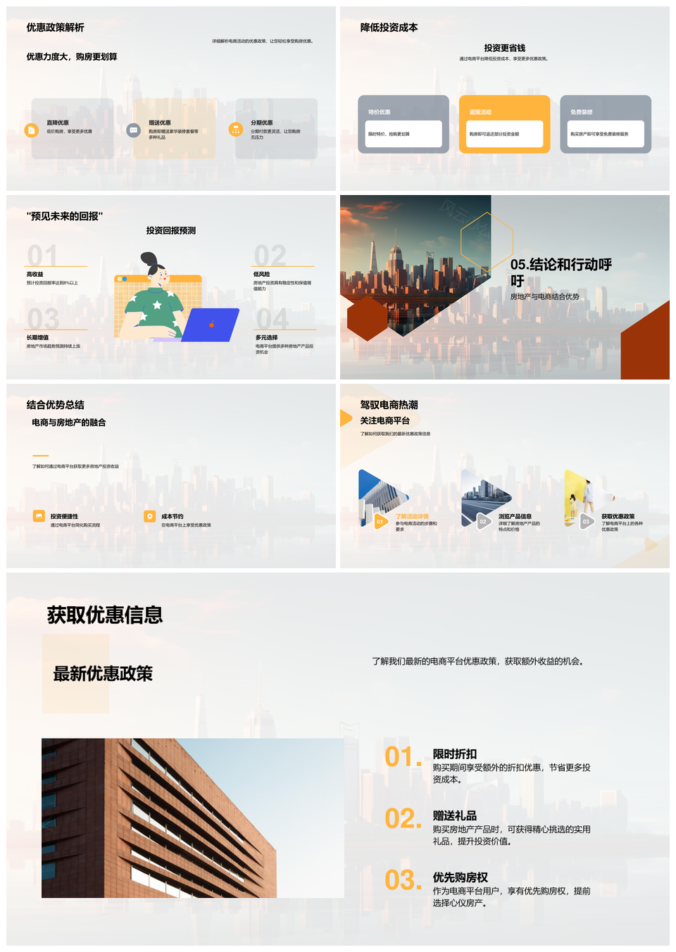 风云办公提供的电商平台房产投资市场趋势与优惠回报PPT模板,下载格式为pptx,一共25页,作品中文字及图均可以修改和编辑,图片更改请在作品中右键图片并更换,文字修改请直接点击文字进行修改。