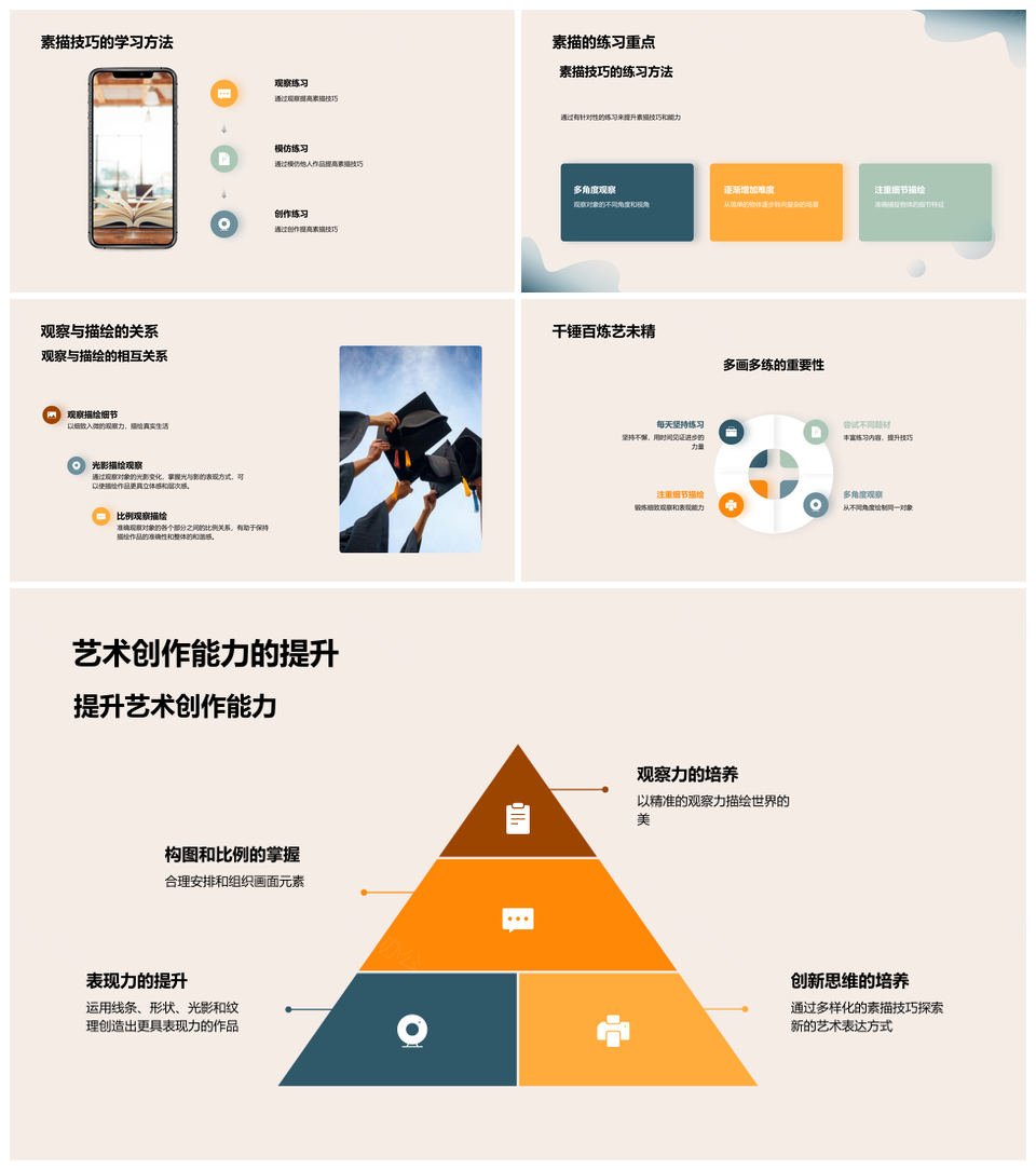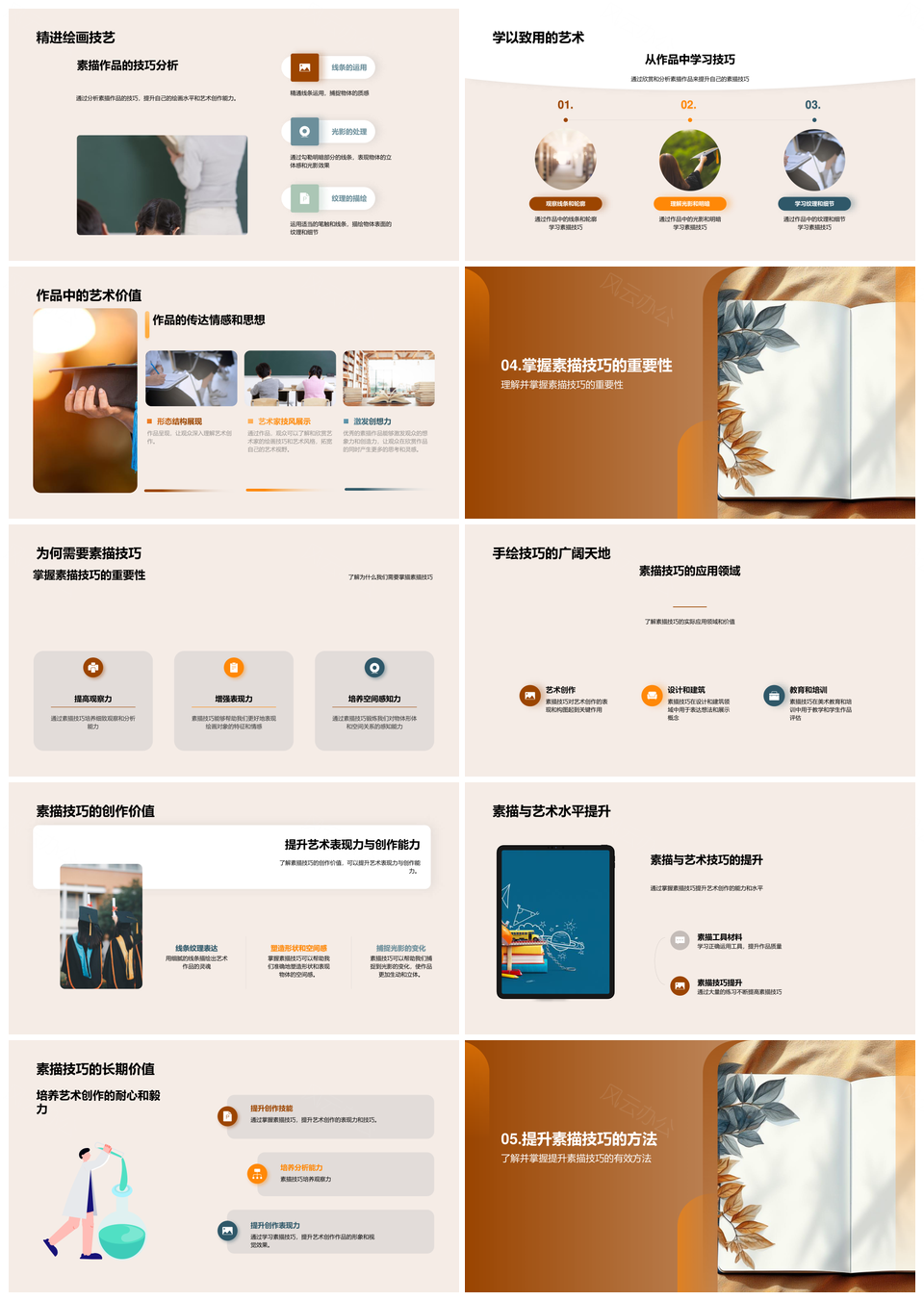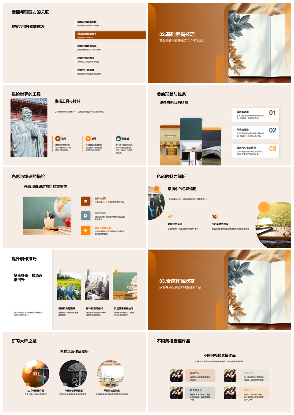 这是一张素描艺术创作技巧提升观察空间感知线条素描本PPT模板,包含素描艺术、创作技巧、提升、观察、空间感知、线条、素描本等主题内容,也可用作素描艺术创作技巧提升、素描艺术创作技巧、艺术创作技巧提升、创作技巧提升观察、技巧提升观察空间、提升观察空间感知、观察空间感知线条、空间感知线条素描本、素描艺术创作、艺术创作技巧、创作技巧提升、技巧提升观察、提升观察空间、观察空间感知、空间感知线条等PPT场景使用。 风云办公提供的素描艺术创作技巧提升观察空间感知线条素描本PPT模板,下载格式为pptx,一共33页,作品中文字及图均可以修改和编辑,图片更改请在作品中右键图片并更换,文字修改请直接点击文字进行修改。