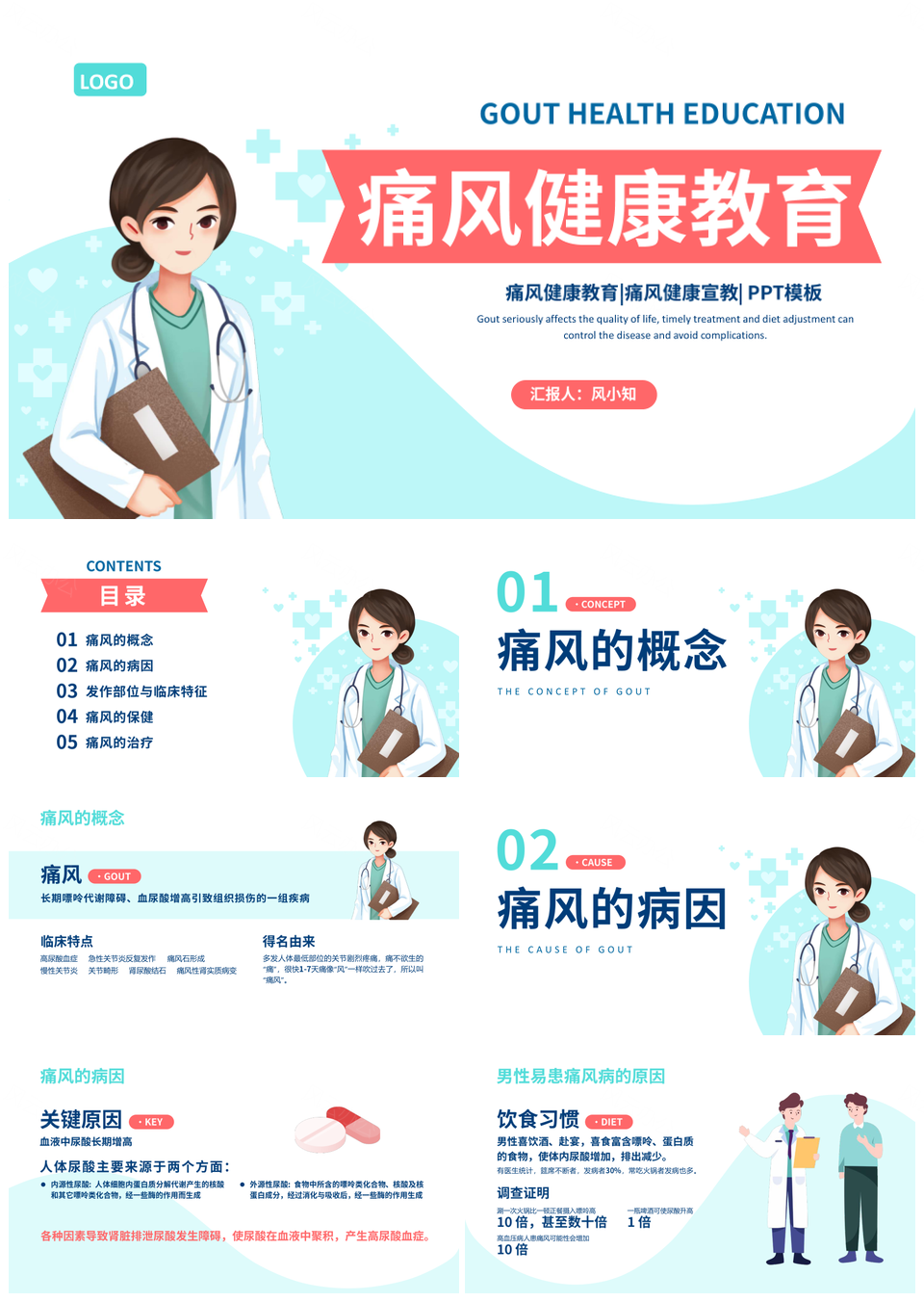 风云办公提供的痛风健康宣教蓝青商务简约插画PPT模板,下载格式为pptx,一共25页,作品中文字及图均可以修改和编辑,图片更改请在作品中右键图片并更换,文字修改请直接点击文字进行修改。