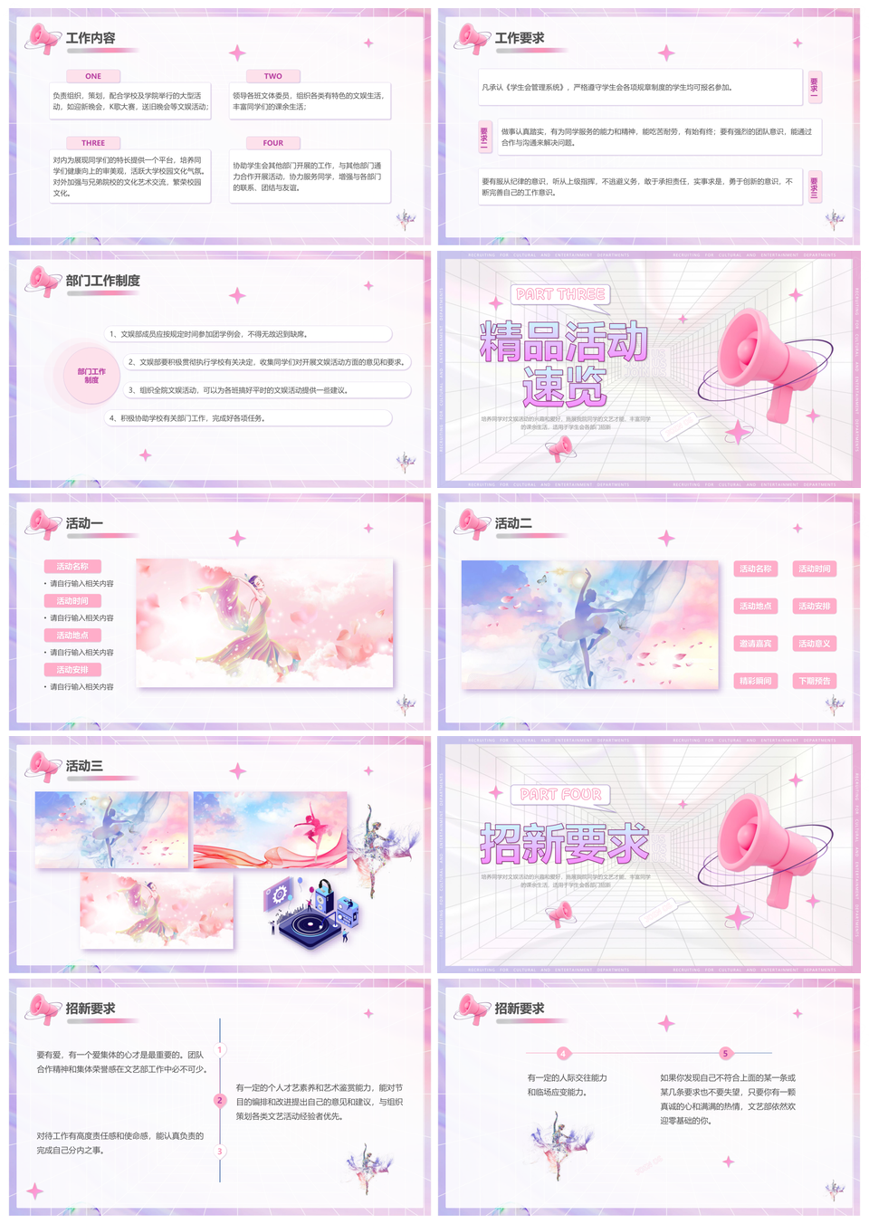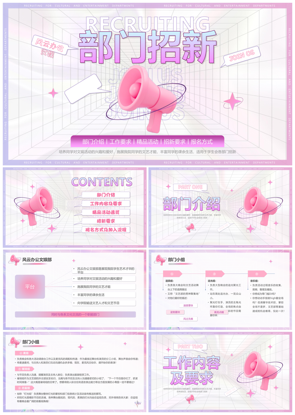 3D微粒体喇叭学生会部门招新活动策划PPT模板推荐