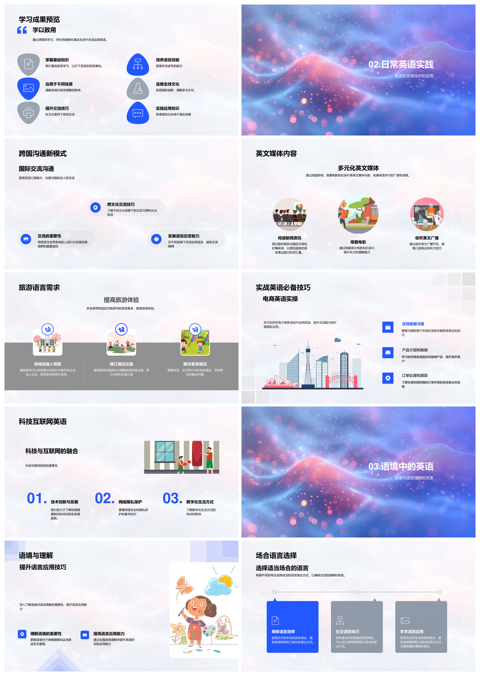 这是一张实用英语语法词汇生活商务交流媒体应用PPT模板,包含实用英语、语法、词汇、生活、商务、交流、媒体、应用等主题内容,也可用作实用英语语法词汇、英语语法词汇生活、语法词汇生活商务、词汇生活商务交流、生活商务交流媒体、商务交流媒体应用、实用英语语法、英语语法词汇、语法词汇生活、词汇生活商务、生活商务交流、商务交流媒体、交流媒体应用、实用英语、英语语法等PPT场景使用。 风云办公提供的实用英语语法词汇生活商务交流媒体应用PPT模板,下载格式为pptx,一共33页,作品中文字及图均可以修改和编辑,图片更改请在作品中右键图片并更换,文字修改请直接点击文字进行修改。