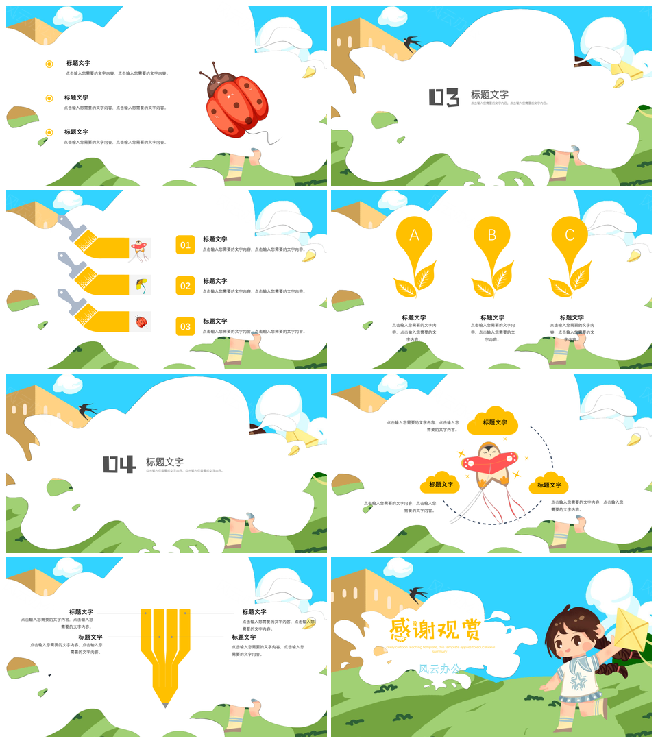 这是一张黄色教育教学可爱卡通班会家长会春天风筝主题PPT模板,包含黄色、教育教学、可爱、卡通、班会、家长会、春天、风筝、主题等主题内容,也可用作春天风筝主题班会、可爱卡通家长会教学、教育教学春天风筝、黄色教育卡通班会、春天风筝家长会、可爱卡通主题班会、教育教学春天主题、班会家长会春天、风筝主题教学、春天风筝、卡通家长会、黄色教育、教学主题等PPT场景使用。 风云办公提供的黄色教育教学可爱卡通班会家长会春天风筝主题PPT模板,下载格式为pptx,一共15页,作品中文字及图均可以修改和编辑,图片更改请在作品中右键图片并更换,文字修改请直接点击文字进行修改。