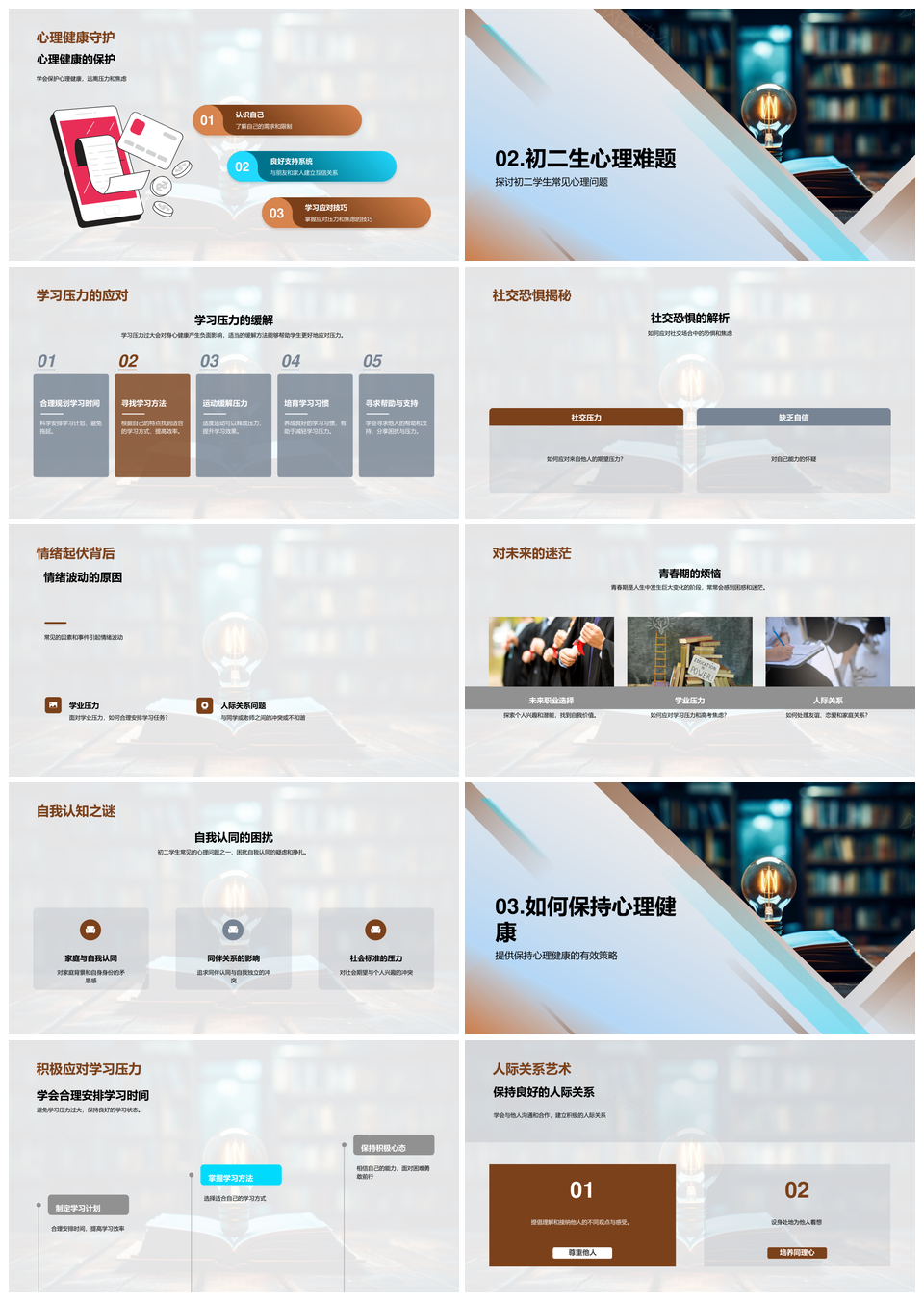 风云办公提供的初二生心理健康与学习压力调适PPT模板,下载格式为pptx,一共33页,作品中文字及图均可以修改和编辑,图片更改请在作品中右键图片并更换,文字修改请直接点击文字进行修改。