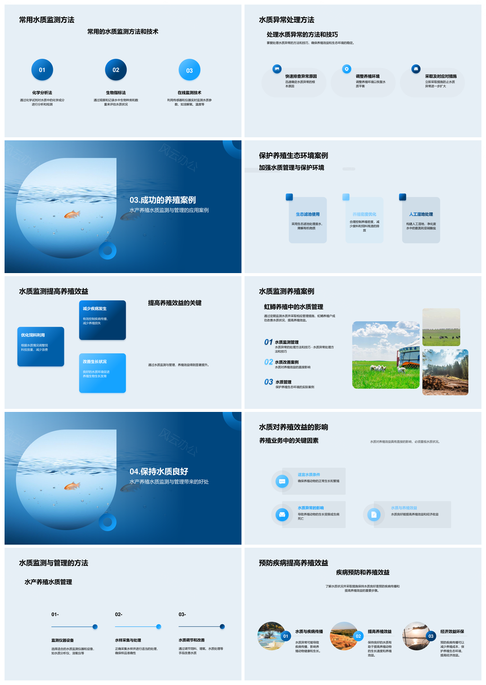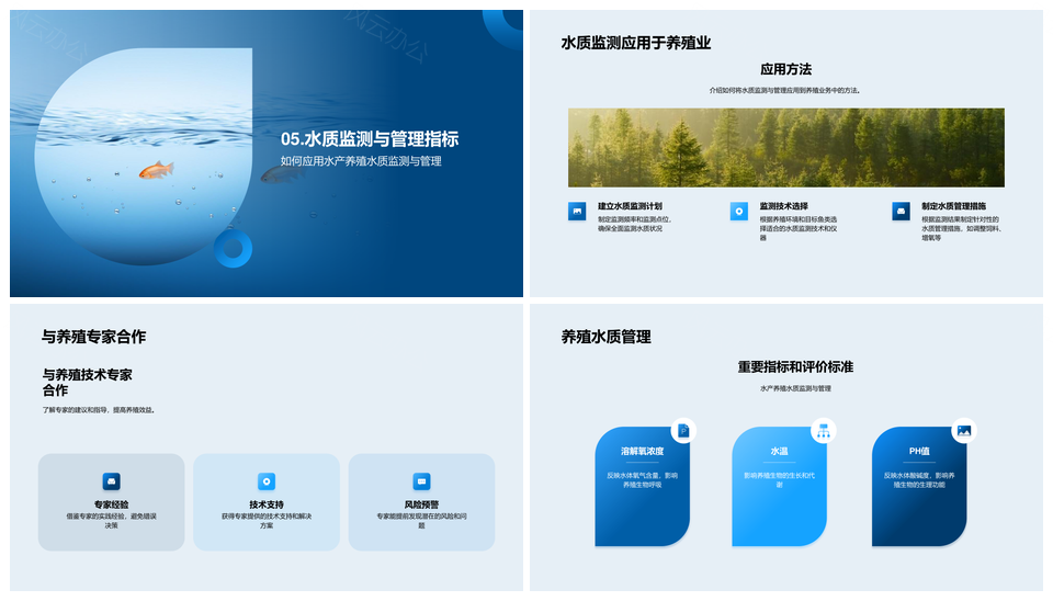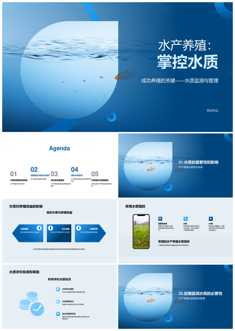 风云办公提供的水产养殖水质监测提效益护环境PPT模板,下载格式为pptx,一共22页,作品中文字及图均可以修改和编辑,图片更改请在作品中右键图片并更换,文字修改请直接点击文字进行修改。