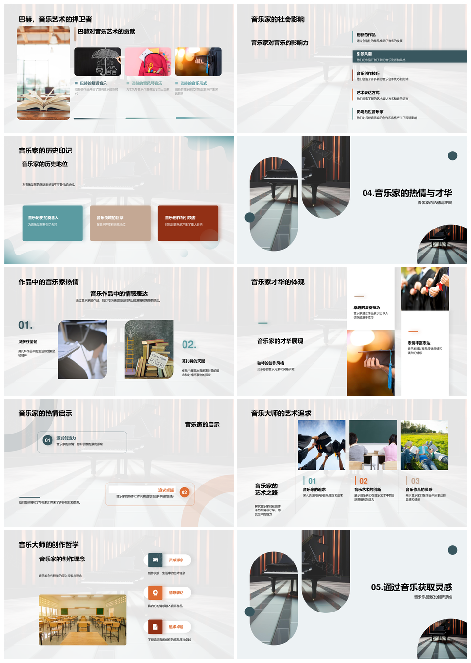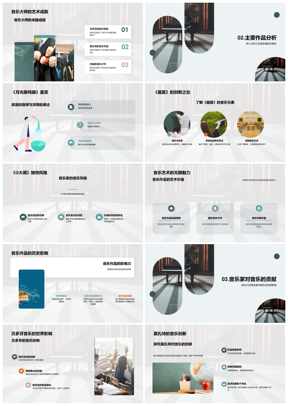 这是一张音乐大师贝多芬莫扎特巴赫钢琴月光魔笛热情创新PPT模板,包含音乐大师、贝多芬、莫扎特、巴赫、钢琴、月光、魔笛、热情、创新等主题内容,也可用作音乐大师贝多芬莫扎特、音乐大师巴赫钢琴、贝多芬钢琴月光热情、莫扎特魔笛热情创新、钢琴月光魔笛热情、贝多芬钢琴月光、莫扎特魔笛热情、巴赫钢琴创新、月光魔笛热情、音乐大师贝多芬、音乐大师钢琴、贝多芬月光魔笛、巴赫月光魔笛、钢琴热情创新、月光魔笛创新等PPT场景使用。 风云办公提供的音乐大师贝多芬莫扎特巴赫钢琴月光魔笛热情创新PPT模板,下载格式为pptx,一共33页,作品中文字及图均可以修改和编辑,图片更改请在作品中右键图片并更换,文字修改请直接点击文字进行修改。