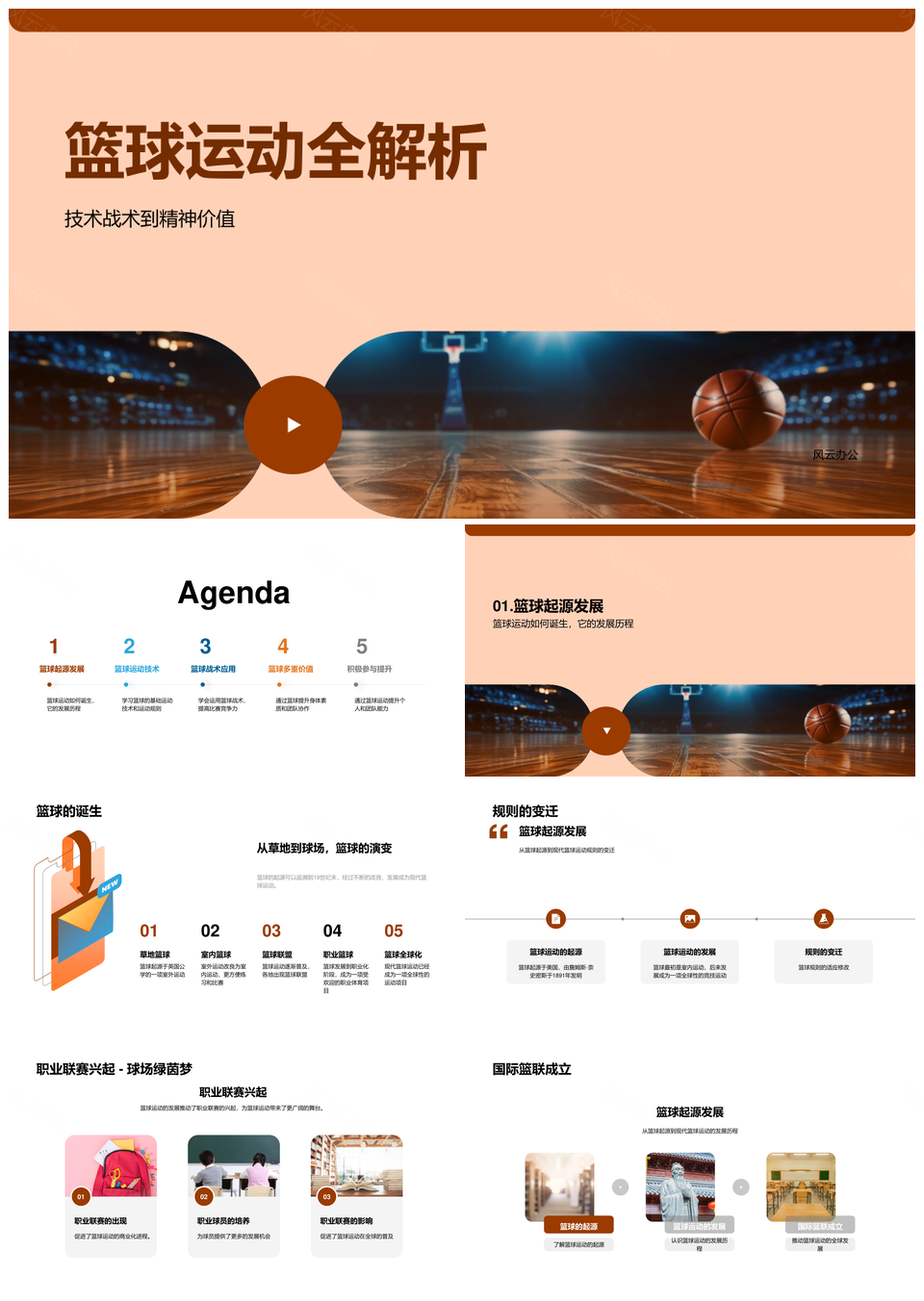 风云办公提供的篮球起源技战术精神价值全解析PPT模板,下载格式为pptx,一共33页,作品中文字及图均可以修改和编辑,图片更改请在作品中右键图片并更换,文字修改请直接点击文字进行修改。