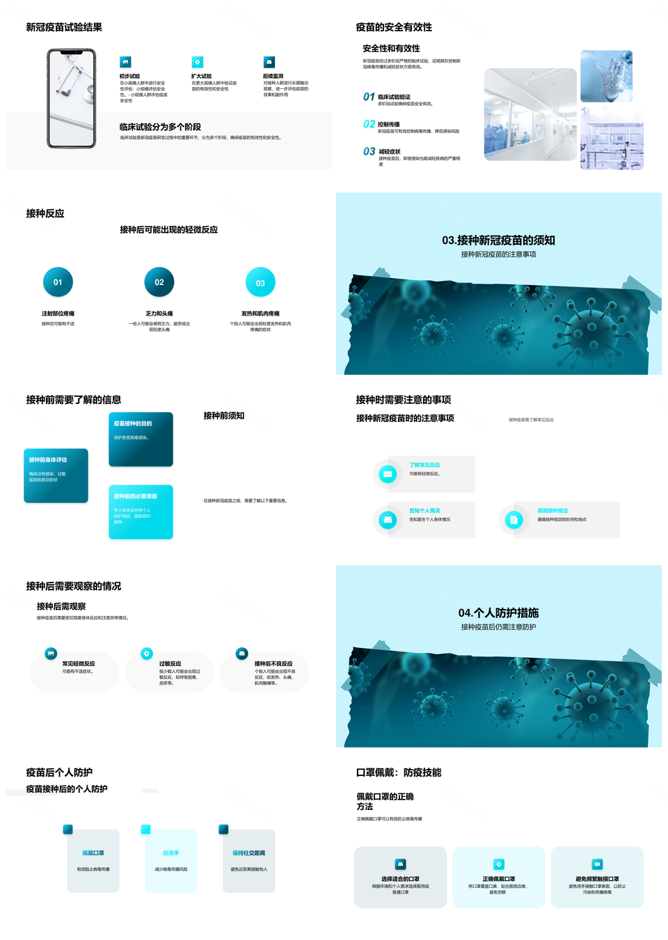 这是一张新冠疫苗安全有效性研究接种临床试验反应PPT模板,包含新冠疫苗、安全有效性、研究、接种、临床试验、反应等主题内容,也可用作新冠疫苗安全有效性研究、新冠疫苗接种临床试验反应、新冠疫苗安全有效性、新冠疫苗临床试验研究、有效性研究接种反应、接种临床试验反应、新冠疫苗安全、新冠疫苗有效性、安全有效性、有效性研究、接种临床试验、临床试验反应、新冠疫苗研究、安全有效性研究、接种反应等PPT场景使用。 风云办公提供的新冠疫苗安全有效性研究接种临床试验反应PPT模板,下载格式为pptx,一共24页,作品中文字及图均可以修改和编辑,图片更改请在作品中右键图片并更换,文字修改请直接点击文字进行修改。