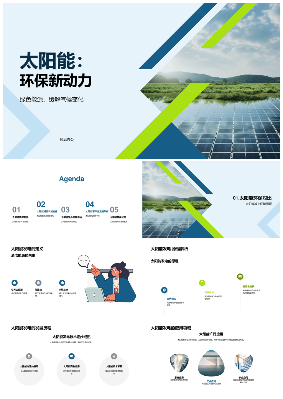 风云办公提供的太阳能发电环保优势引领清洁能源PPT模板,下载格式为pptx,一共26页,作品中文字及图均可以修改和编辑,图片更改请在作品中右键图片并更换,文字修改请直接点击文字进行修改。