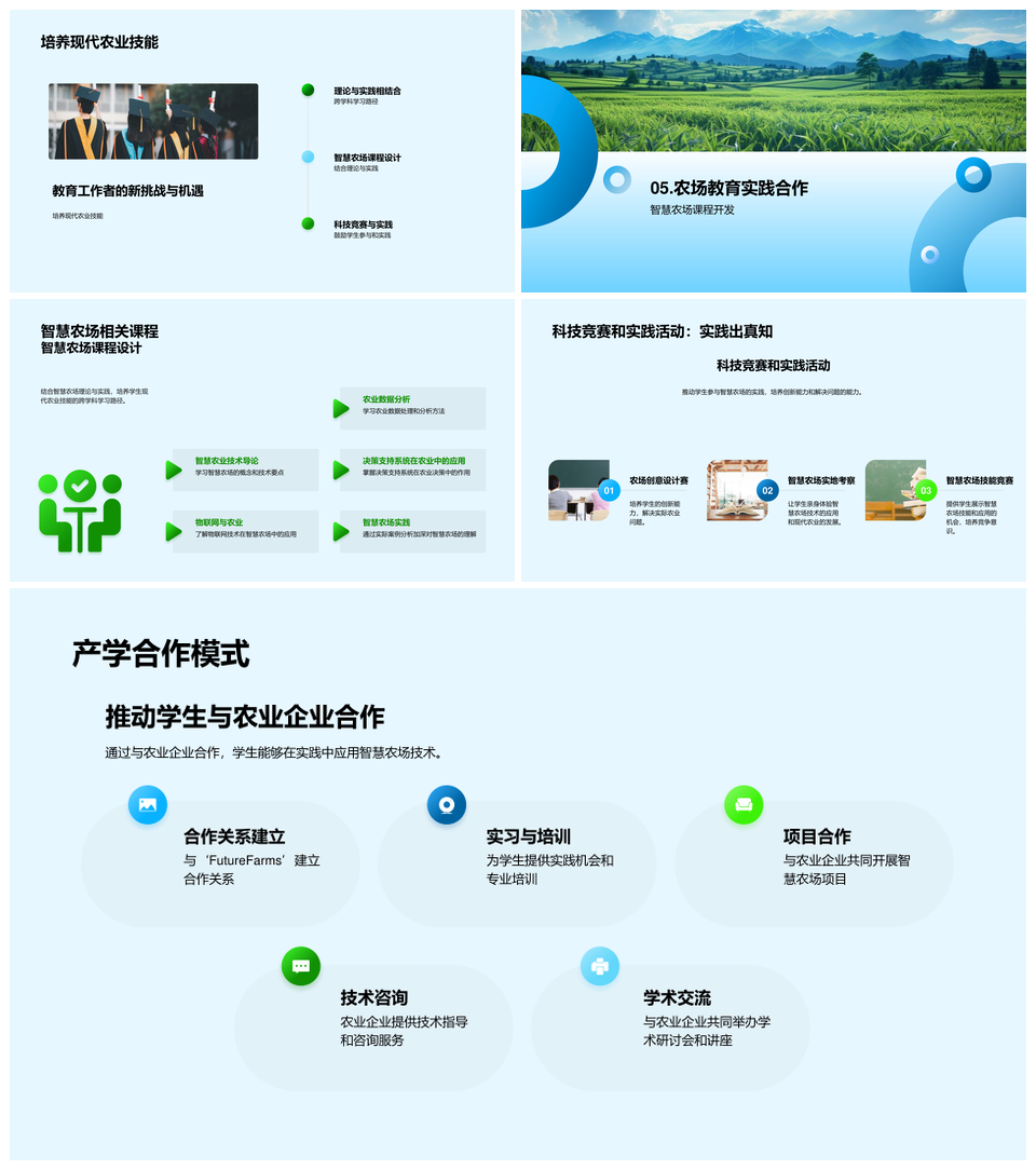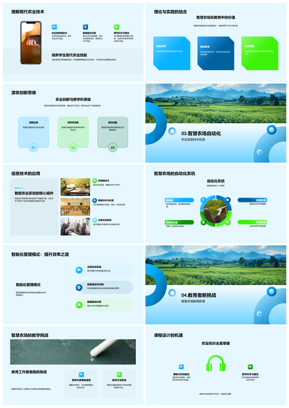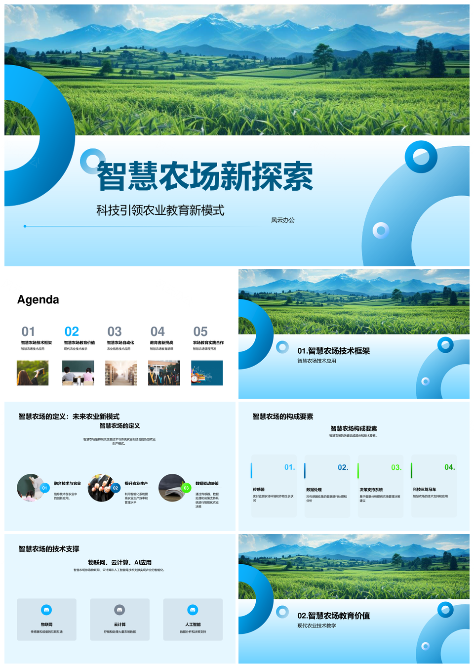 风云办公提供的智慧农场科技引领农业教育革新PPT模板,下载格式为pptx,一共23页,作品中文字及图均可以修改和编辑,图片更改请在作品中右键图片并更换,文字修改请直接点击文字进行修改。