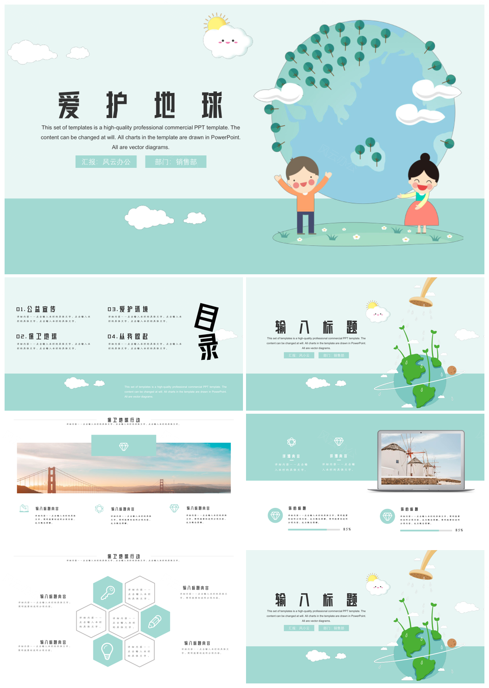 这是一张绿色清新保护地球公益PPT模板,包含绿色、清新、保护地球、公益等主题内容,也可用作绿色、清新、保护、地球、公益