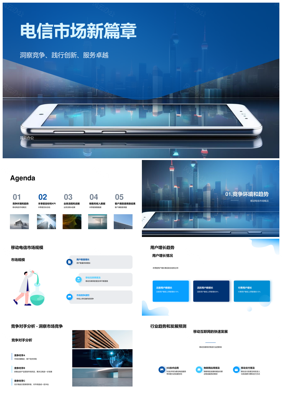 风云办公提供的移动电信市场竞争趋势分析及发展预测PPT模板,下载格式为pptx,一共22页,作品中文字及图均可以修改和编辑,图片更改请在作品中右键图片并更换,文字修改请直接点击文字进行修改。