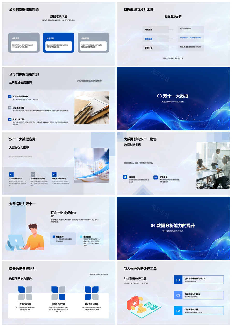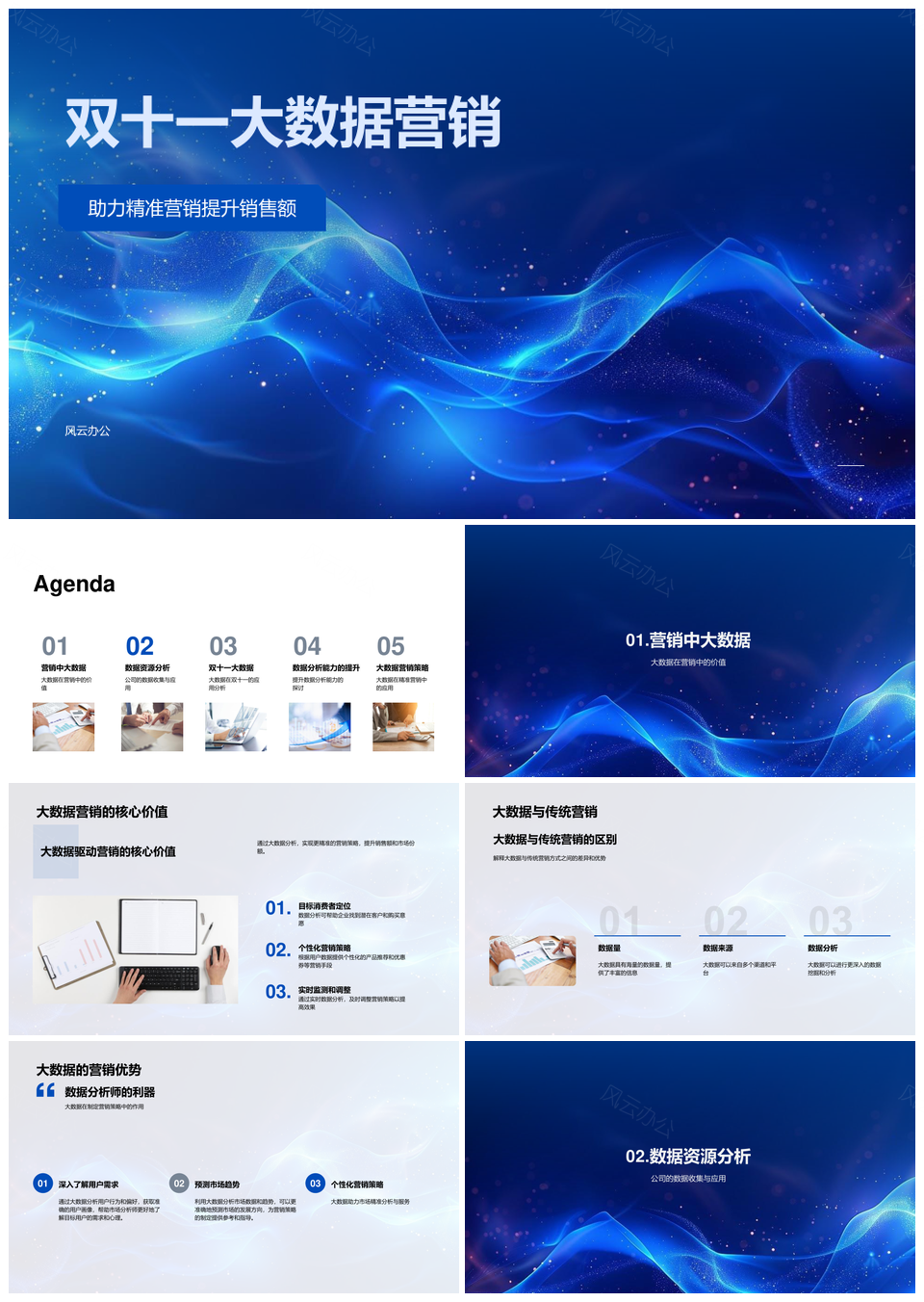 风云办公提供的双十一大数据精准营销销售额PPT模板,下载格式为pptx,一共23页,作品中文字及图均可以修改和编辑,图片更改请在作品中右键图片并更换,文字修改请直接点击文字进行修改。