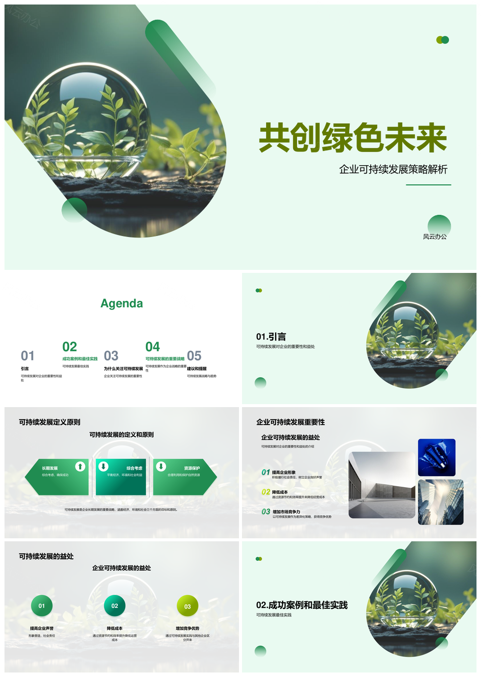 风云办公提供的企业可持续实践共创绿未来PPT模板,下载格式为pptx,一共24页,作品中文字及图均可以修改和编辑,图片更改请在作品中右键图片并更换,文字修改请直接点击文字进行修改。