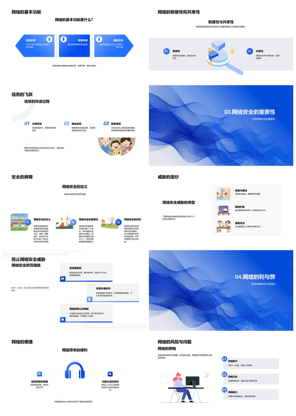 这是一张初一网络基础与安全教学PPT模板,包含网络基础、安全、教学等主题内容,也可用作初一网络基础安全、网络基础安全教学、初一网络基础、初一网络安全、初一安全教学、网络基础安全、网络安全教学、基础安全教学、初一网络、初一基础、初一安全、网络基础、网络安全、基础安全、安全教学等PPT场景使用。 风云办公提供的初一网络基础与安全教学PPT模板,下载格式为pptx,一共23页,作品中文字及图均可以修改和编辑,图片更改请在作品中右键图片并更换,文字修改请直接点击文字进行修改。