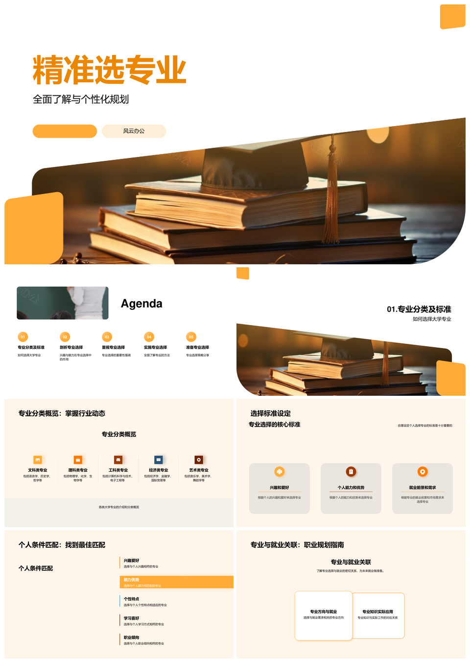 风云办公提供的精准选专业分类匹配就业前景兴趣能力PPT模板,下载格式为pptx,一共33页,作品中文字及图均可以修改和编辑,图片更改请在作品中右键图片并更换,文字修改请直接点击文字进行修改。