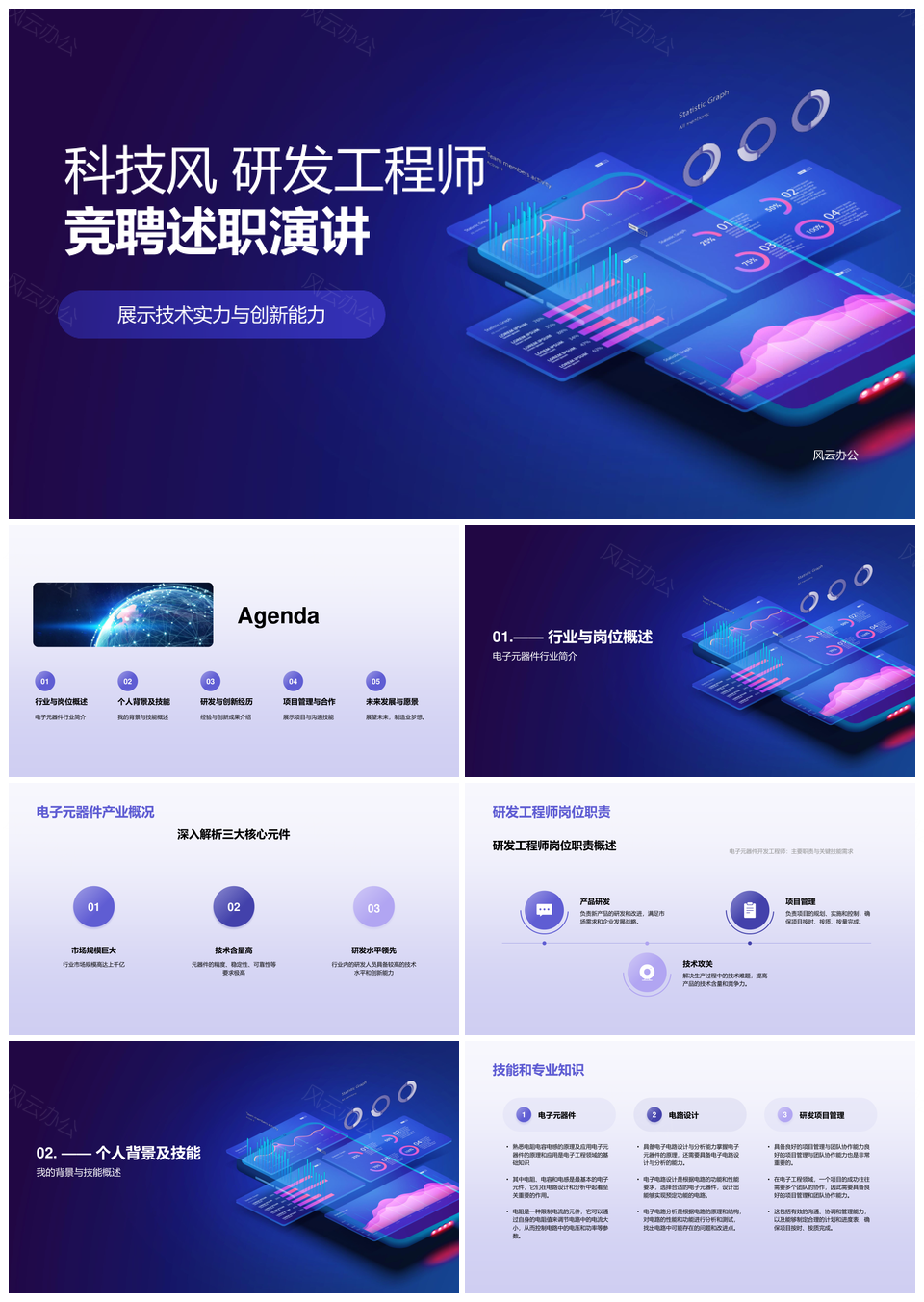 风云办公提供的蓝色科技风研发工程师竞聘述职PPT模板,下载格式为pptx,一共20页,作品中文字及图均可以修改和编辑,图片更改请在作品中右键图片并更换,文字修改请直接点击文字进行修改。