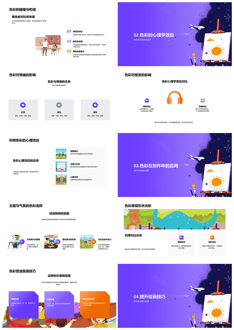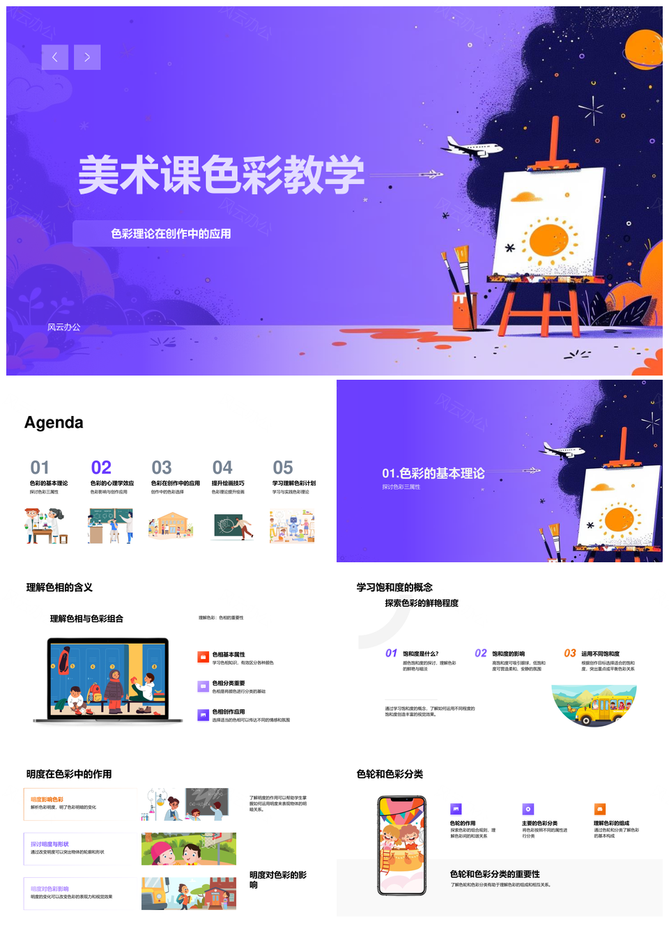 风云办公提供的美术色彩教学理论与创作应用PPT模板,下载格式为pptx,一共27页,作品中文字及图均可以修改和编辑,图片更改请在作品中右键图片并更换,文字修改请直接点击文字进行修改。