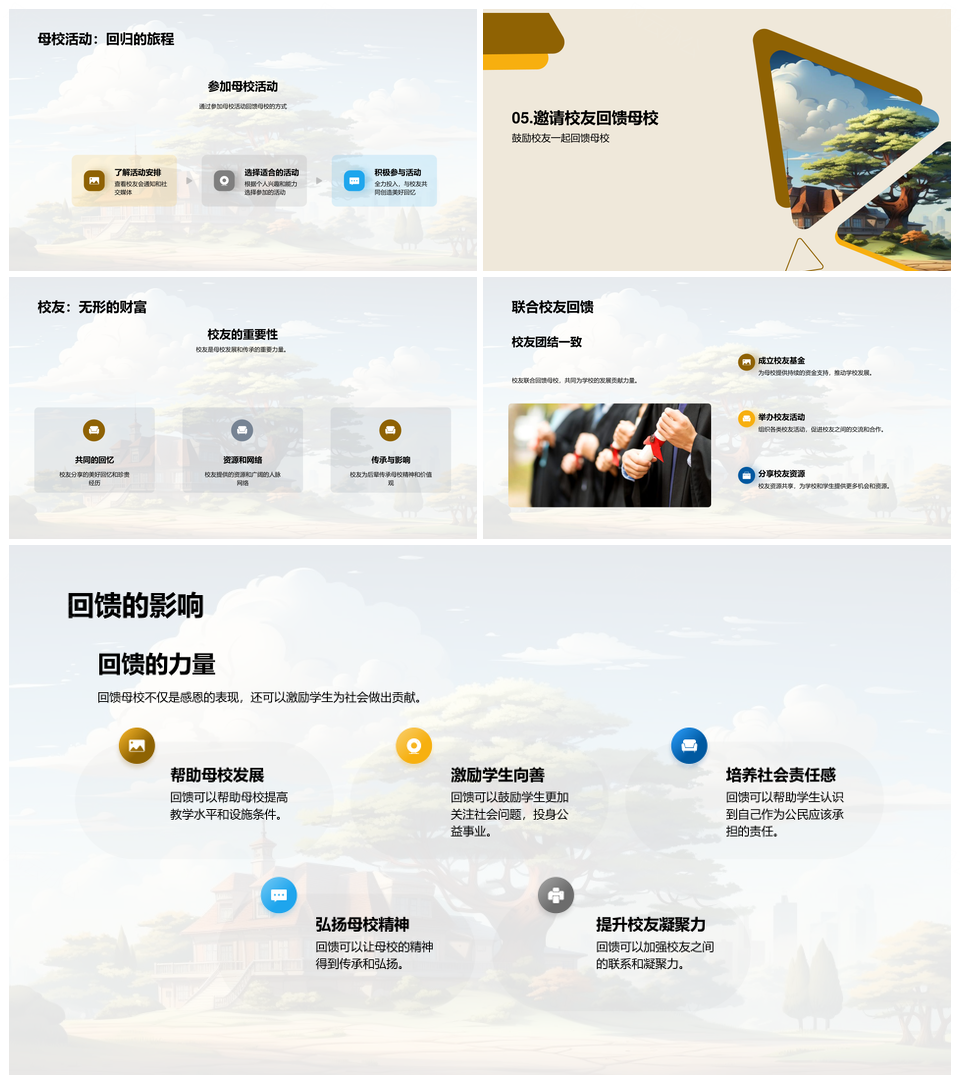 这是一张校友母亲节感恩捐资助教建校PPT模板,包含校友、母亲节、感恩、捐资、助教、建校等主题内容,也可用作校友母亲节感恩捐资、母亲节感恩捐资助教、感恩捐资助教建校、校友捐资助教建校、校友母亲节感恩、母亲节感恩捐资、校友捐资助教、捐资助教建校、校友感恩助教、母亲节助教建校、校友母亲节、母亲节感恩、感恩捐资、捐资助教、助教建校等PPT场景使用。