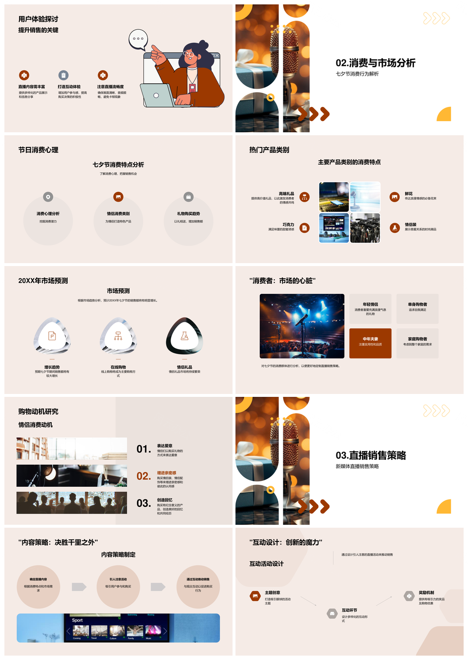 这是一张七夕直播销售新媒体策略情侣消费市场分析PPT模板,包含七夕、直播、销售、新媒体、策略、情侣、消费、市场、分析等主题内容,也可用作七夕直播销售新媒体、直播销售新媒体策略、策略情侣消费市场、情侣消费市场分析、七夕直播销售、直播销售新媒体、销售新媒体策略、新媒体策略情侣、情侣消费市场、消费市场分析、七夕直播、直播销售、销售新媒体、新媒体策略、策略情侣等PPT场景使用。 风云办公提供的七夕直播销售新媒体策略情侣消费市场分析PPT模板,下载格式为pptx,一共33页,作品中文字及图均可以修改和编辑,图片更改请在作品中右键图片并更换,文字修改请直接点击文字进行修改。