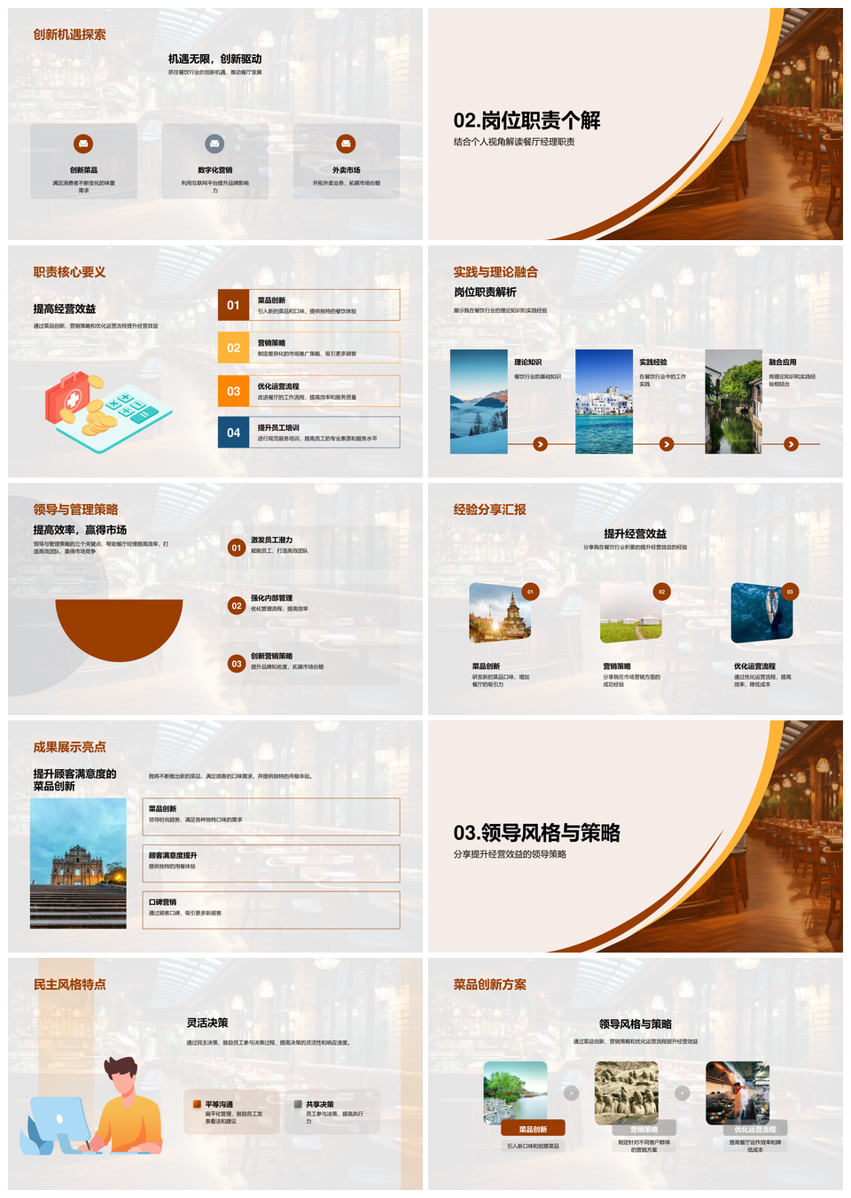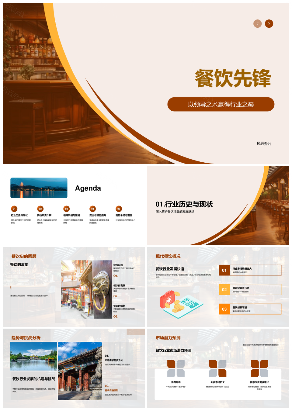 风云办公提供的餐饮先锋经理领导菜品创新与营销战略PPT模板,下载格式为pptx,一共33页,作品中文字及图均可以修改和编辑,图片更改请在作品中右键图片并更换,文字修改请直接点击文字进行修改。