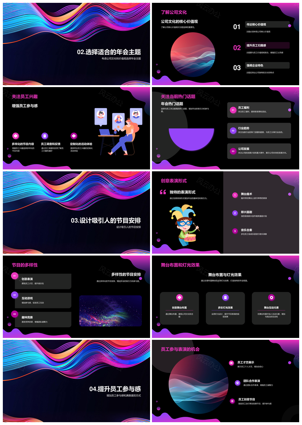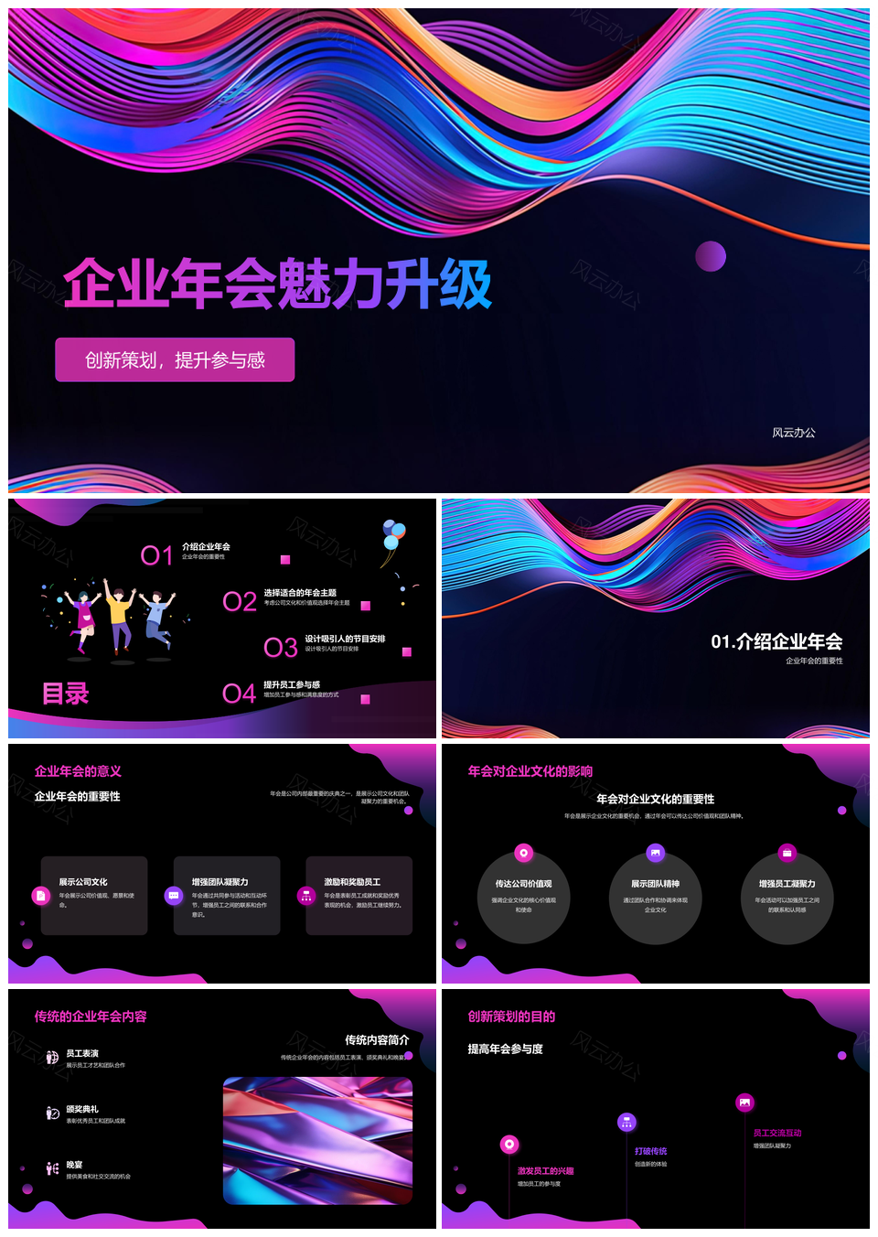 风云办公提供的企业年会创新策划互动文化汇报升级PPT模板,下载格式为pptx,一共20页,作品中文字及图均可以修改和编辑,图片更改请在作品中右键图片并更换,文字修改请直接点击文字进行修改。