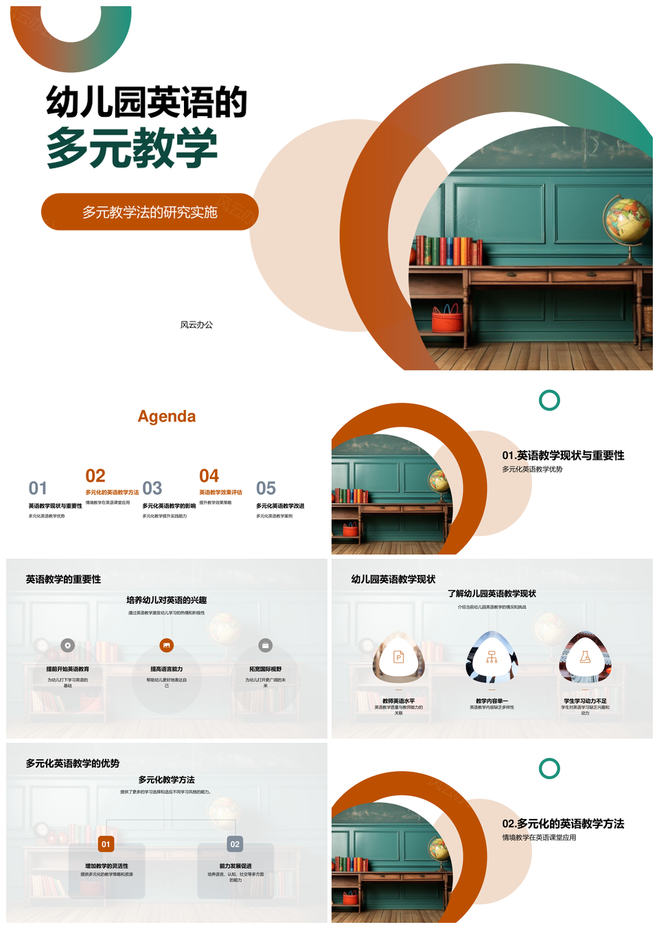 风云办公提供的幼儿园英语多元情境游戏主题教学PPT模板,下载格式为pptx,一共23页,作品中文字及图均可以修改和编辑,图片更改请在作品中右键图片并更换,文字修改请直接点击文字进行修改。