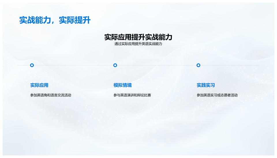 这是一张高效英语分阶学习提升就业听说能力PPT模板,包含高效英语、分阶学习、提升、就业、听说能力等主题内容,也可用作高效英语分阶学习、英语分阶学习提升、分阶学习提升就业、学习提升就业听说、提升就业听说能力、高效英语分阶、英语分阶学习、分阶学习提升、学习提升就业、提升就业听说、就业听说能力、高效英语、分阶学习、提升就业、听说能力等PPT场景使用。