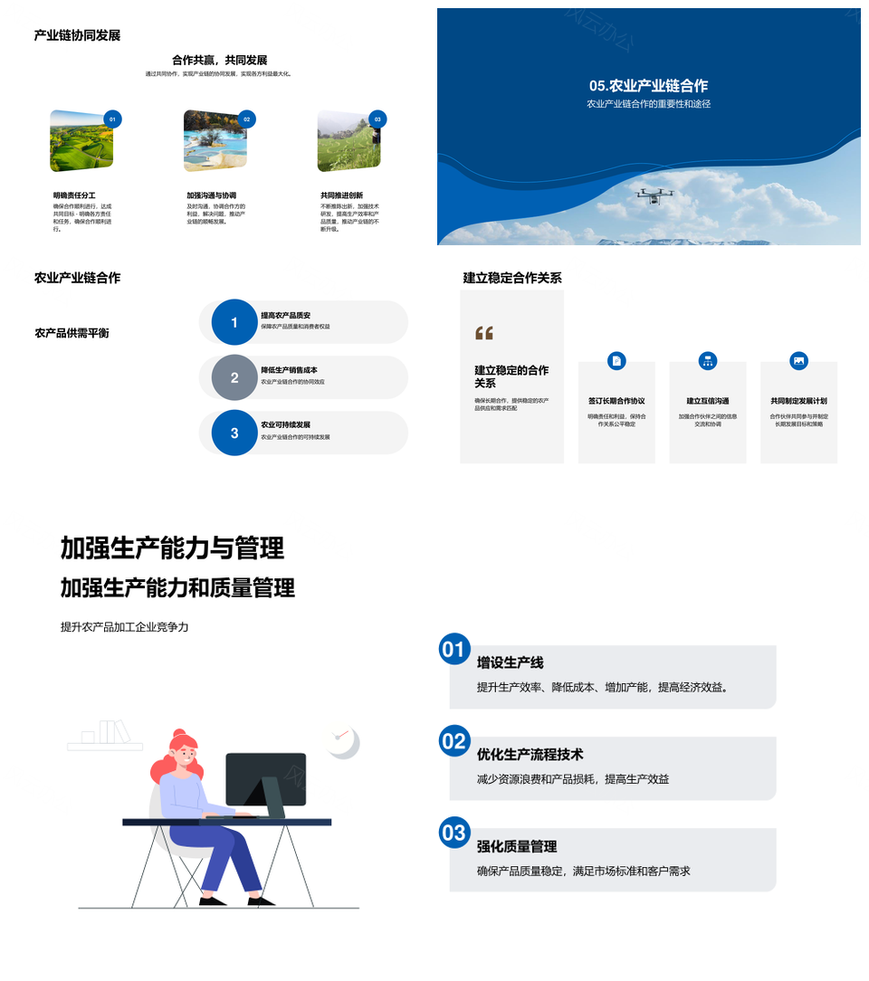 这是一张农业产业链合作下加工企业规模发展与竞争压力PPT模板,包含农业产业链、合作、加工企业、规模发展、竞争压力等主题内容,也可用作农业产业链合作加工企业、产业链合作加工企业规模发展、农业加工企业规模发展竞争压力、加工企业规模发展竞争压力、农业产业链合作规模发展、产业链合作加工企业竞争压力、农业产业链规模发展竞争压力、合作加工企业规模发展竞争压力、农业产业链合作加工、产业链合作规模发展竞争、农业产业链加工企业、加工企业规模发展竞争、合作加工企业规模发展、产业链规模发展竞争压力、农业产业链合作等PPT场景使用。 风云办公提供的农业产业链合作下加工企业规模发展与竞争压力PPT模板,下载格式为pptx,一共23页,作品中文字及图均可以修改和编辑,图片更改请在作品中右键图片并更换,文字修改请直接点击文字进行修改。