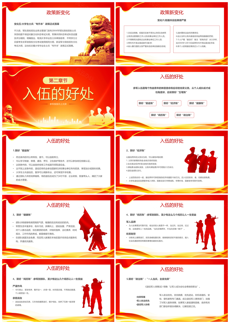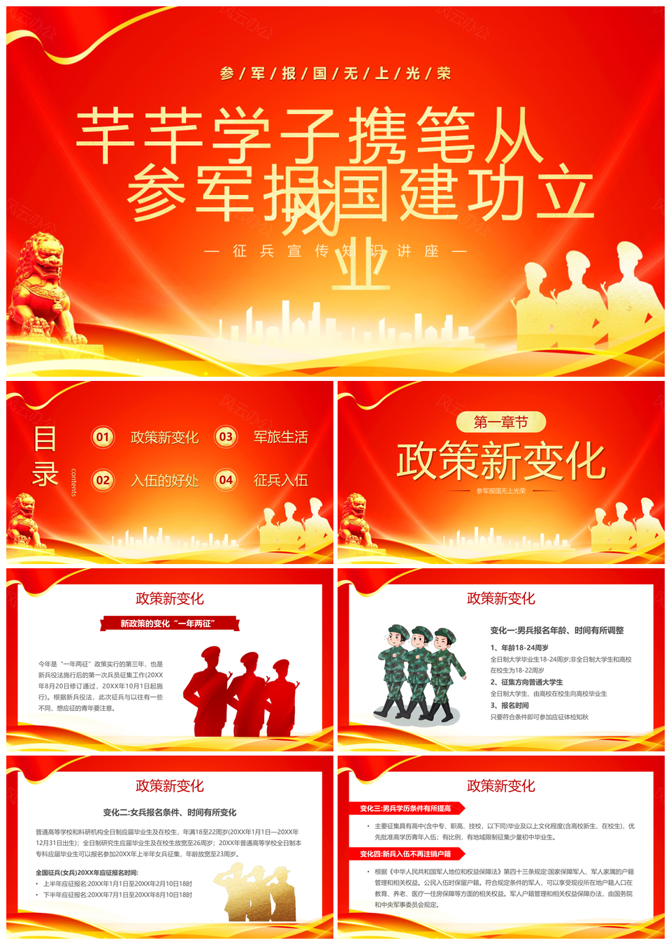 这是一张2023红色参军报国政策资助公益宣传PPT模板,包含红色、参军报国、政策、资助、公益宣传等主题内容,也可用作红色参军报国政策、参军报国政策资助、报国政策资助公益、政策资助公益宣传、红色参军报国公益、红色参军政策资助、参军报国公益宣传、红色参军公益宣传、参军报国政策公益、红色参军报国、参军报国政策、报国政策资助、政策资助公益、资助公益宣传、红色政策资助公益等PPT场景使用。 风云办公提供的2023红色参军报国政策资助公益宣传PPT模板,下载格式为pptx,一共25页,作品中文字及图均可以修改和编辑,图片更改请在作品中右键图片并更换,文字修改请直接点击文字进行修改。