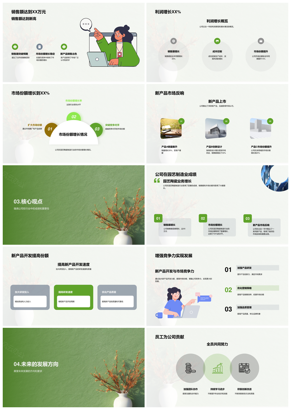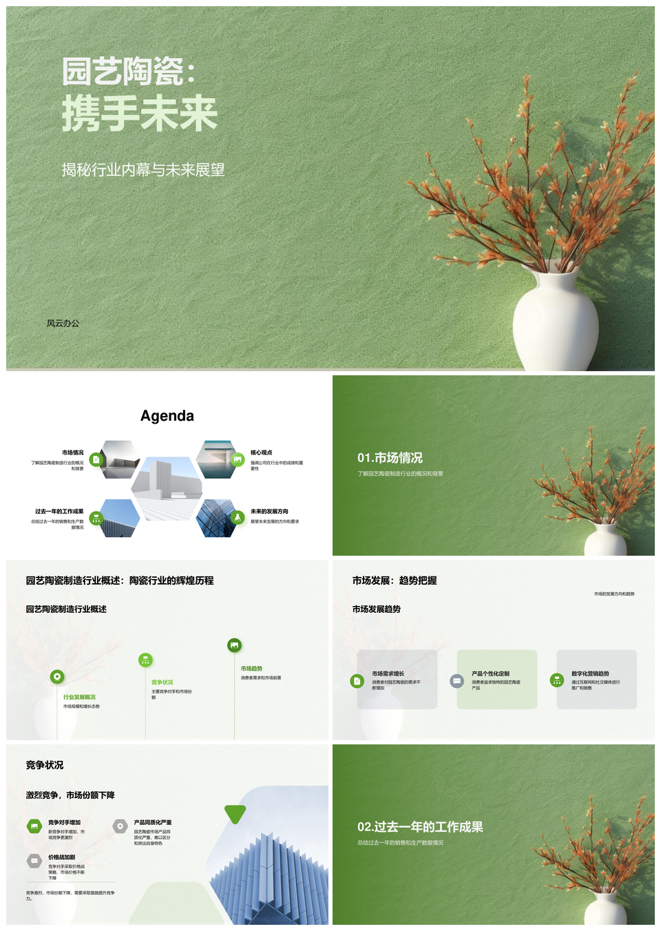 这是一张园艺陶瓷制造年终总结行业趋势竞争销售生产数据PPT模板,包含园艺、陶瓷、制造、年终总结、行业、趋势、竞争、销售、生产、数据等主题内容,也可用作园艺陶瓷制造行业趋势竞争、制造年终总结行业趋势竞争、年终总结行业趋势竞争销售、行业趋势竞争销售生产数据、园艺陶瓷制造年终总结生产数据、园艺陶瓷行业趋势生产数据、年终总结竞争销售生产数据、制造行业趋势竞争生产数据、行业趋势销售生产数据、制造竞争销售生产数据、园艺陶瓷生产数据、竞争生产数据、年终总结销售生产数据、制造销售生产数据、行业趋势竞争生产数据等PPT场景使用。 风云办公提供的园艺陶瓷制造年终总结行业趋势竞争销售生产数据PPT模板,下载格式为pptx,一共20页,作品中文字及图均可以修改和编辑,图片更改请在作品中右键图片并更换,文字修改请直接点击文字进行修改。