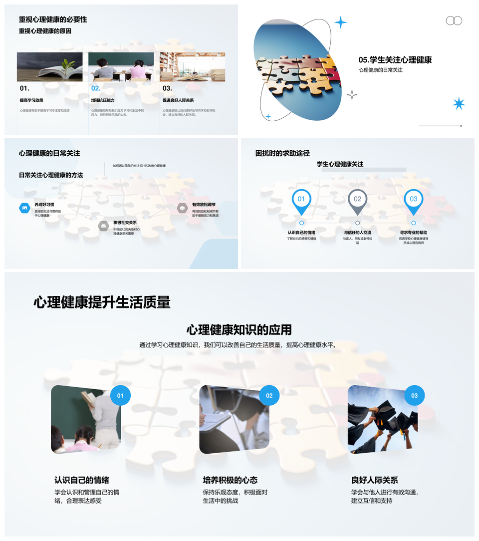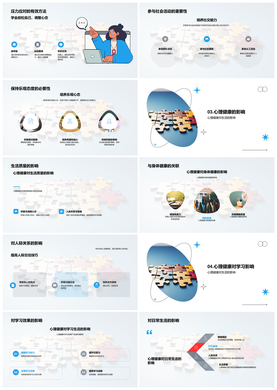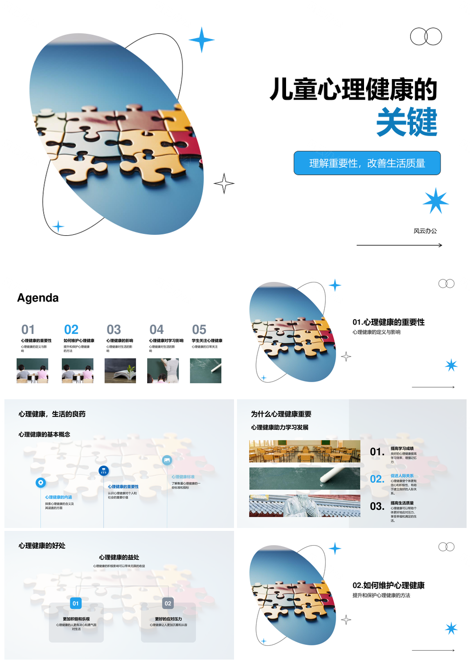 风云办公提供的儿童心理健康拼图助力学效人际体健PPT模板,下载格式为pptx,一共23页,作品中文字及图均可以修改和编辑,图片更改请在作品中右键图片并更换,文字修改请直接点击文字进行修改。