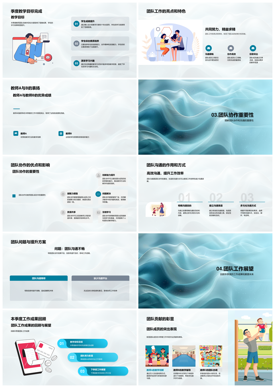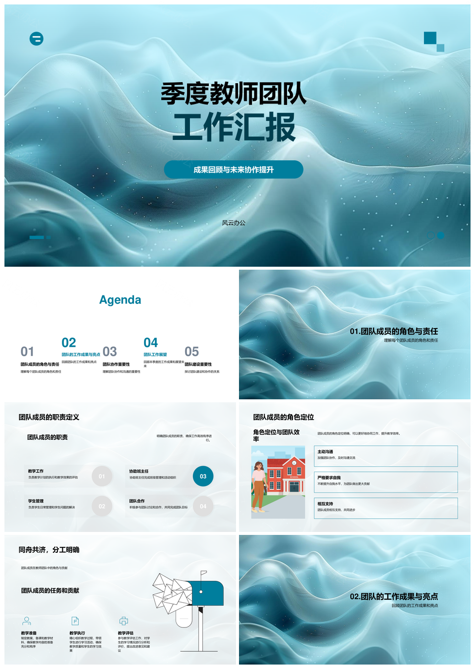 风云办公提供的教师团队季度成果总结与协作提升PPT模板,下载格式为pptx,一共23页,作品中文字及图均可以修改和编辑,图片更改请在作品中右键图片并更换,文字修改请直接点击文字进行修改。