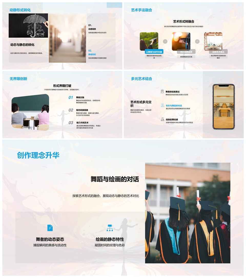 这是一张舞动绘影动静艺融PPT模板,包含舞动、绘影、动静、艺融等主题内容,也可用作舞动绘影动静艺融、舞动绘影动静、绘影动静艺融、舞动绘影、绘影动静、动静艺融、舞动绘影动静艺、绘影动静艺融动、动静艺融艺、舞动绘、绘动静、动静艺、艺融、舞动静、影动静艺等PPT场景使用。 风云办公提供的舞动绘影动静艺融PPT模板,下载格式为pptx,一共33页,作品中文字及图均可以修改和编辑,图片更改请在作品中右键图片并更换,文字修改请直接点击文字进行修改。