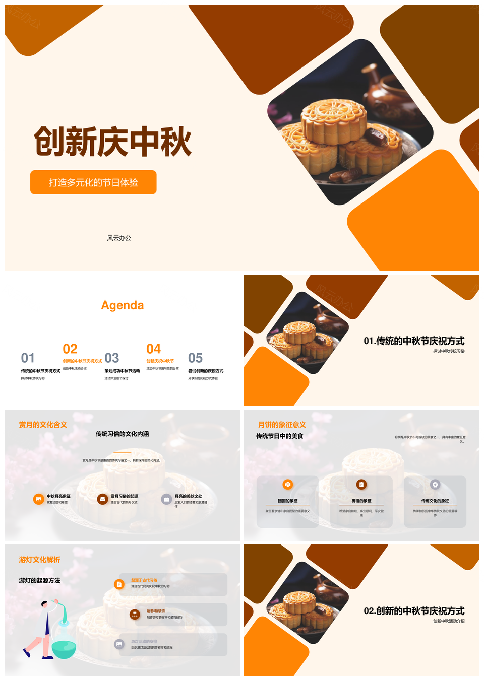 风云办公提供的创新庆中秋多元体验赏月游灯品月饼PPT模板,下载格式为pptx,一共22页,作品中文字及图均可以修改和编辑,图片更改请在作品中右键图片并更换,文字修改请直接点击文字进行修改。