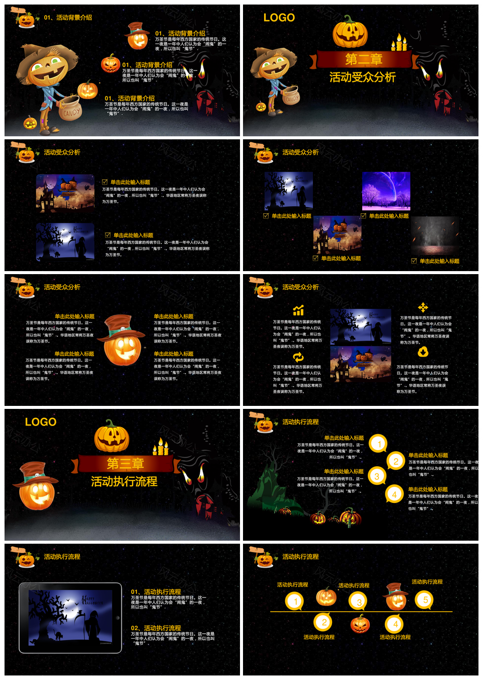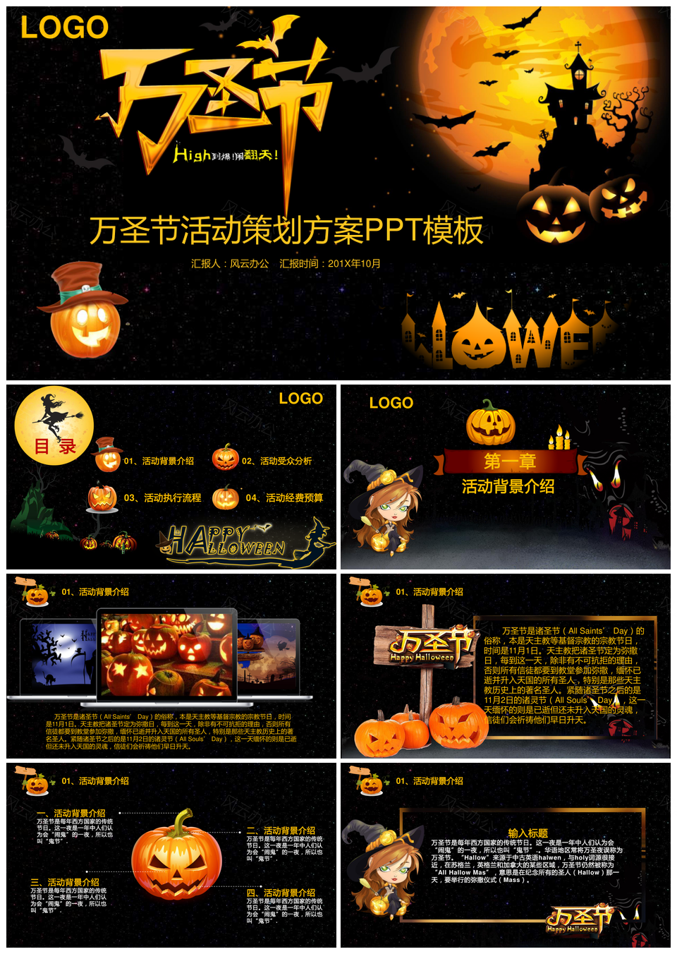 这是一张万圣节活动策划方案PPT模板,包含万圣节、活动、策划、方案等主题内容,也可用作万圣节、活动、策划、方案 万圣节活动策划方案、万圣节活动策划、万圣节活动方案、活动策划方案、万圣节活动、活动策划、活动方案、策划方案等PPT场景使用。 风云办公提供的万圣节活动策划方案PPT模板,下载格式为pptx,一共23页,作品中文字及图均可以修改和编辑,图片更改请在作品中右键图片并更换,文字修改请直接点击文字进行修改。