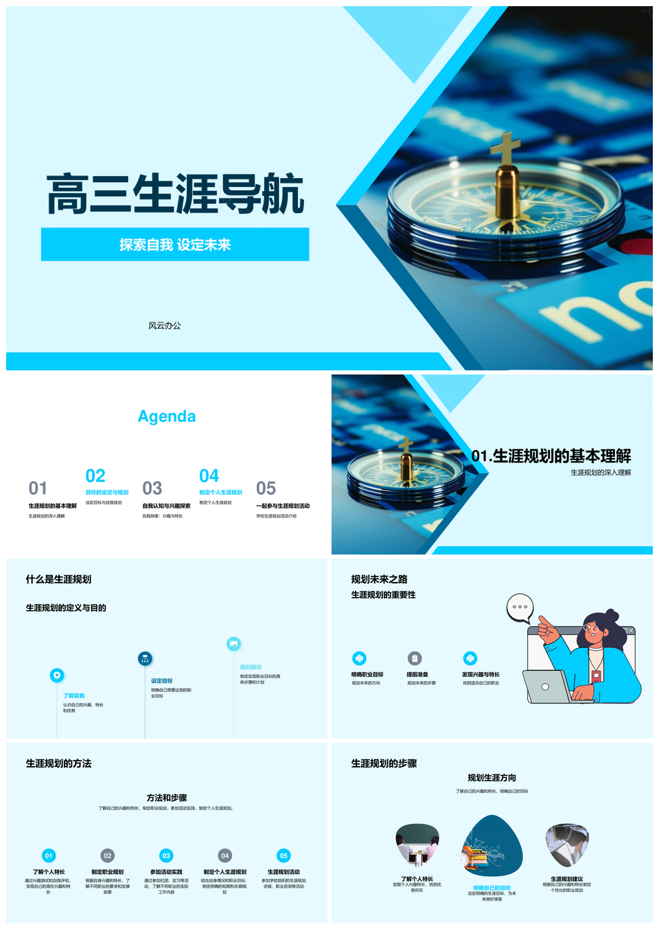 风云办公提供的高三生涯导航自我探索目标规划PPT模板,下载格式为pptx,一共28页,作品中文字及图均可以修改和编辑,图片更改请在作品中右键图片并更换,文字修改请直接点击文字进行修改。