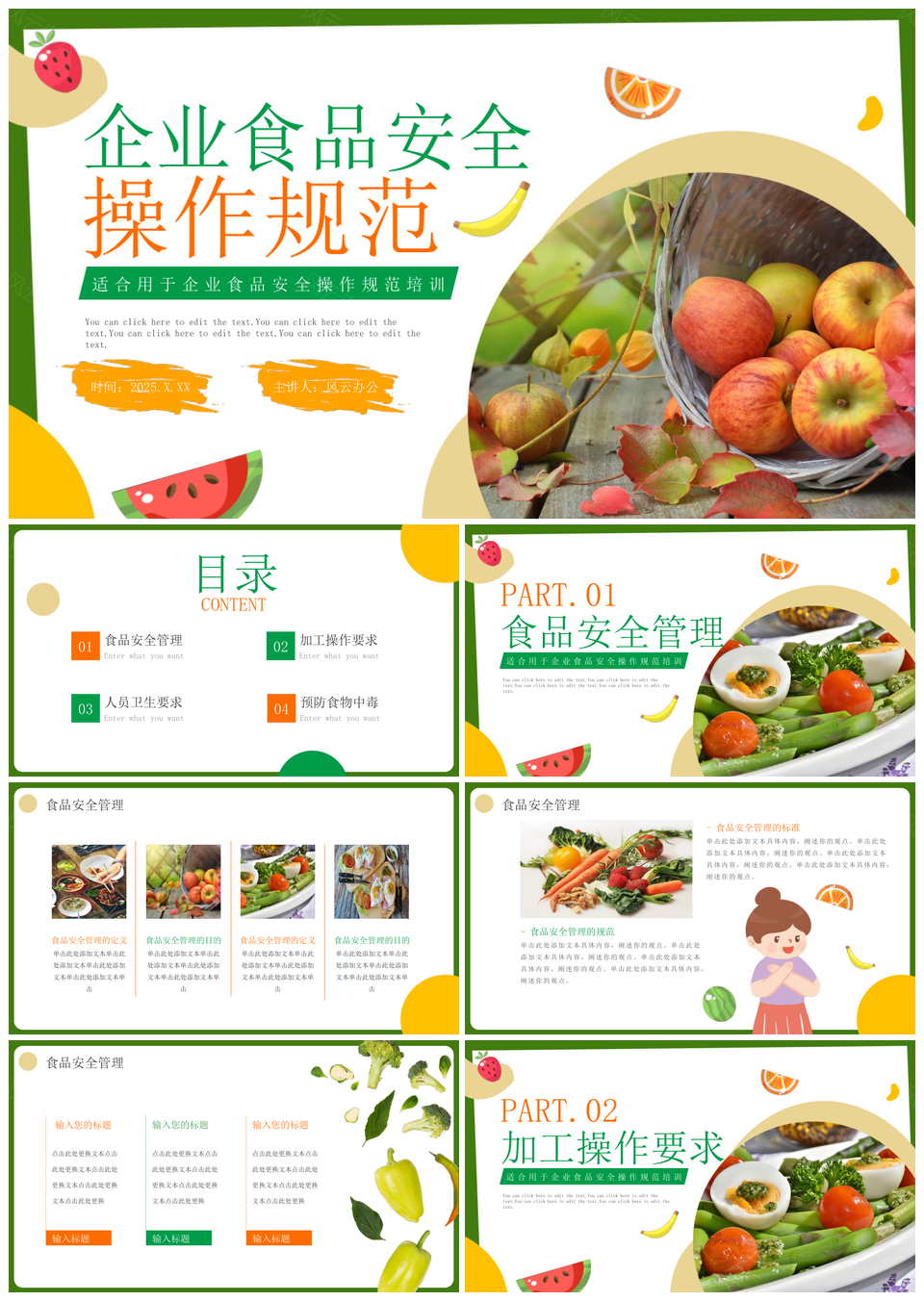 这是一张2025企业食品安全实景操作培训商务PPT模板,包含2025、企业、食品安全、实景操作、培训、商务等主题内容,也可用作2025企业食品安全实景操作、企业食品安全实景操作培训、食品安全实景操作培训商务、2025企业实景操作培训、企业实景操作培训商务、2025企业食品安全、企业食品安全实景操作、食品安全实景操作培训、实景操作培训商务、2025企业实景操作、企业实景操作培训、企业培训商务、2025实景操作培训、企业食品安全商务、企业食品安全等PPT场景使用。 风云办公提供的2025企业食品安全实景操作培训商务PPT模板,下载格式为pptx,一共19页,作品中文字及图均可以修改和编辑,图片更改请在作品中右键图片并更换,文字修改请直接点击文字进行修改。