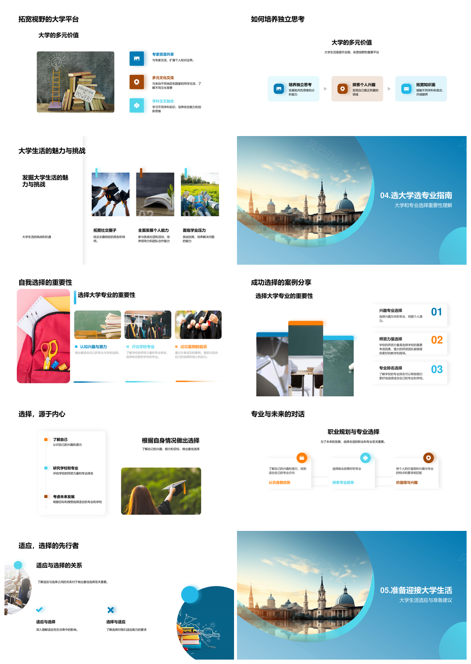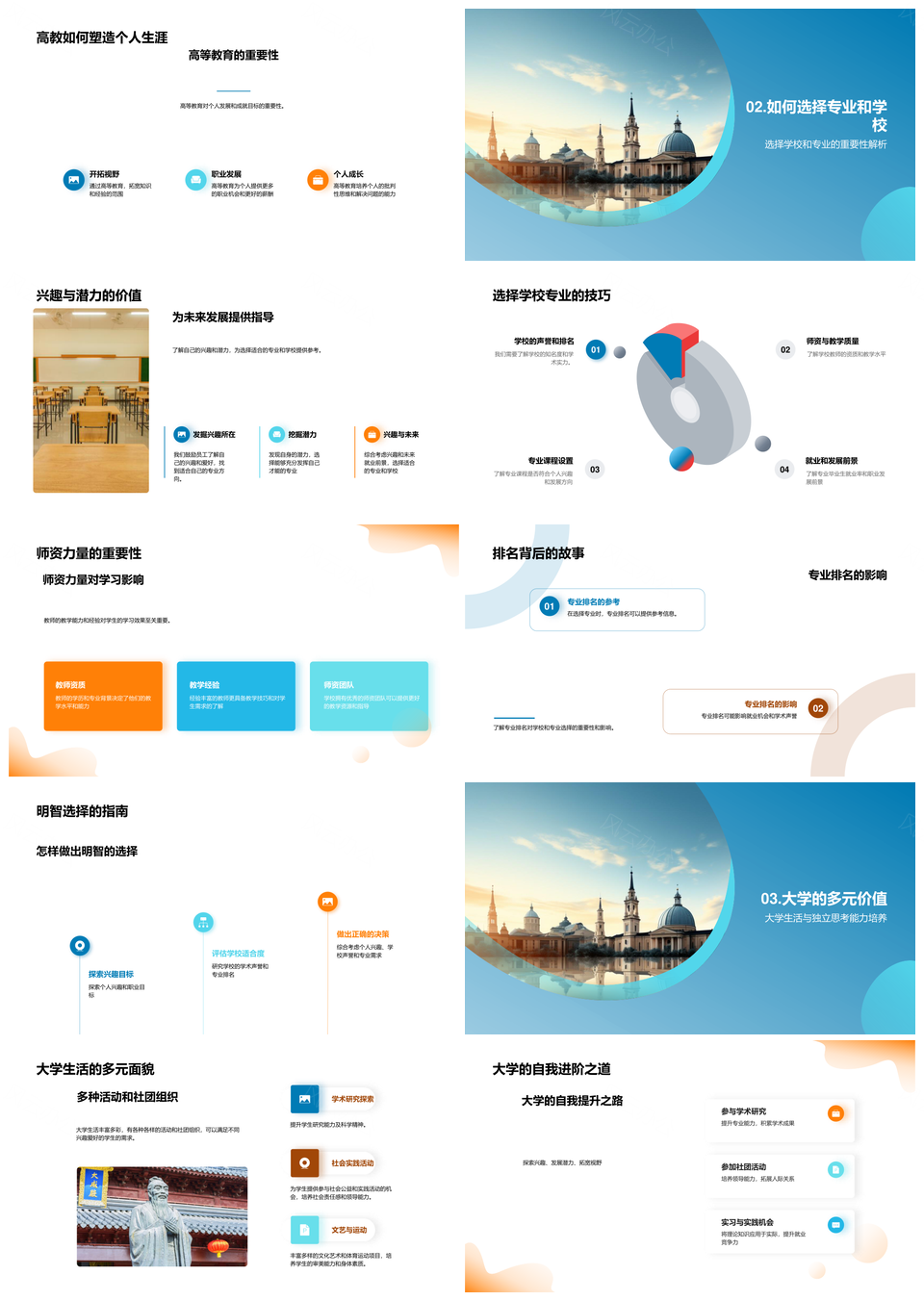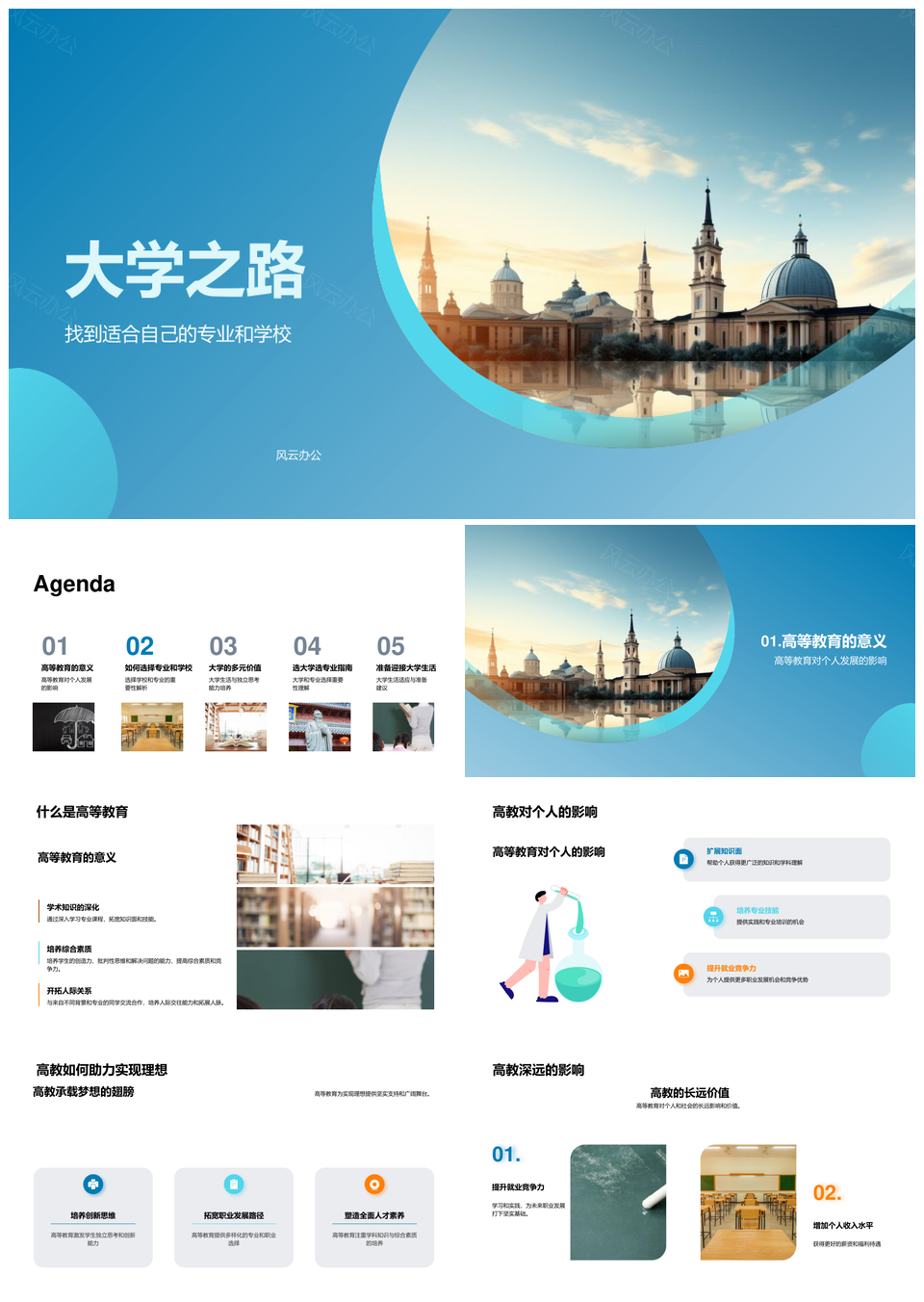 风云办公提供的大学之路高等教育专业择校与个人发展PPT模板,下载格式为pptx,一共33页,作品中文字及图均可以修改和编辑,图片更改请在作品中右键图片并更换,文字修改请直接点击文字进行修改。