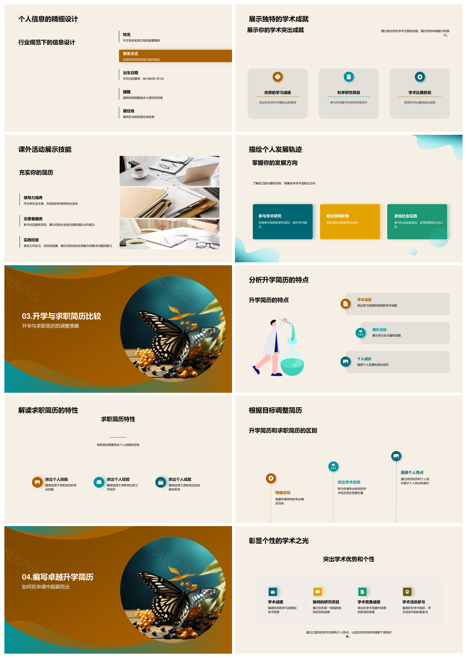 这是一张蝶变升学简历铸卓越之路PPT模板,包含蝶变、升学、简历、卓越之路等主题内容,也可用作蝶变升学简历卓越、蝶变升学卓越之路、升学简历卓越之路、蝶变升学简历之路、升学简历卓越、简历卓越之路、卓越之路、蝶变卓越之路、升学卓越之路、蝶变升学、升学简历、简历卓越、卓越之路、蝶变之路、升学之路等PPT场景使用。 风云办公提供的蝶变升学简历铸卓越之路PPT模板,下载格式为pptx,一共24页,作品中文字及图均可以修改和编辑,图片更改请在作品中右键图片并更换,文字修改请直接点击文字进行修改。