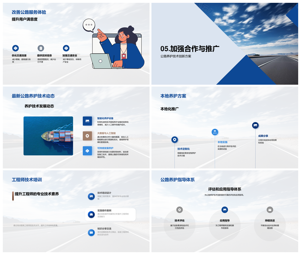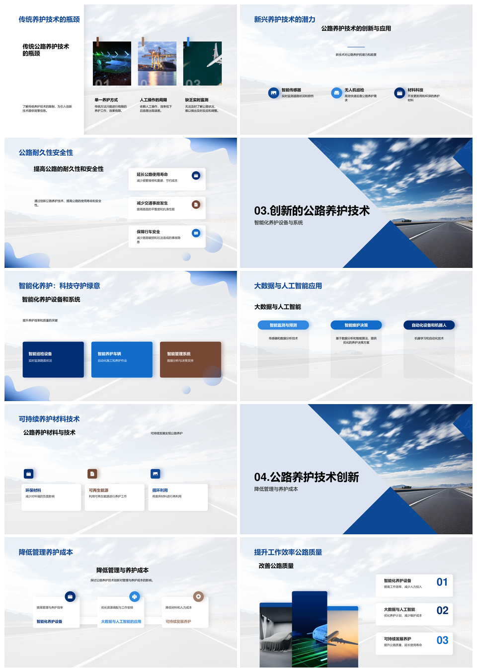 这是一张智能公路养护技术创新提升质量效率耐久性PPT模板,包含智能公路、养护技术、创新、提升、质量、效率、耐久性等主题内容,也可用作智能公路养护技术、公路养护技术创新、技术创新提升质量、提升质量效率耐久性、智能公路养护、公路养护技术、养护技术创新、技术创新提升、创新提升质量、提升质量效率、质量效率耐久性、智能公路、养护技术、技术创新、质量效率等PPT场景使用。 风云办公提供的智能公路养护技术创新提升质量效率耐久性PPT模板,下载格式为pptx,一共24页,作品中文字及图均可以修改和编辑,图片更改请在作品中右键图片并更换,文字修改请直接点击文字进行修改。